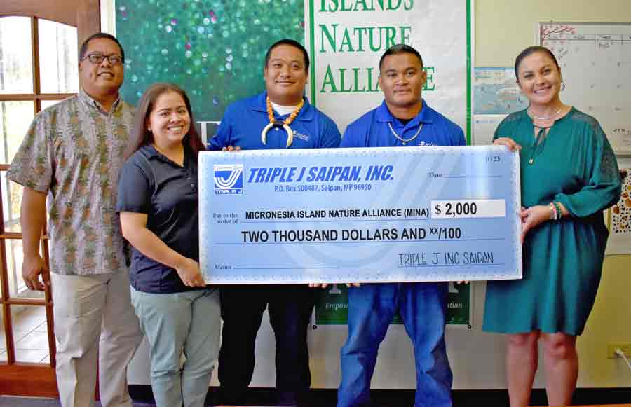 Triple J Saipan presented a $2,000 sponsorship check yesterday to the Marianas Islands Nature Alliance. The cash contribution will support this year’s “Green Gala”’ and the overall mission and efforts by MINA to improve environmental conservation efforts in the CNMI. Present for the check presentation were, from left, Jay Santos, general manager, Triple J Five Star Wholesale and Truckload; Becky Furey, program manager, MINA; Delfin Camacho, Tasi Watch community ranger; Austin Piteg, Tasi Watch community ranger; and Tracy Guerrero, Triple J corporate controller. (Contributed Photo)