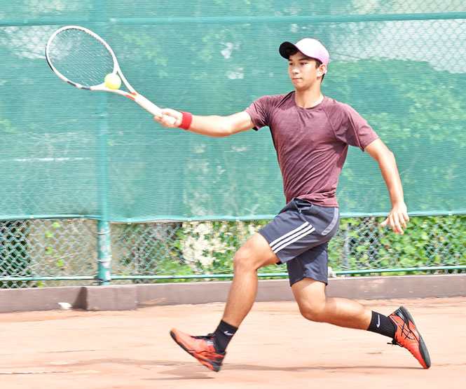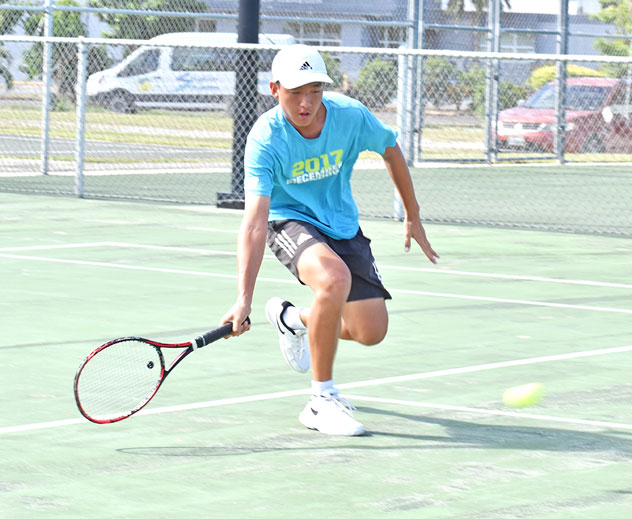 Jimin Woo hits a low ball during his boys U18 singles game against Malika Miyawaki in the 10th TanHoldings Tennis Classic at the American Memorial Park tennis courts last month.
