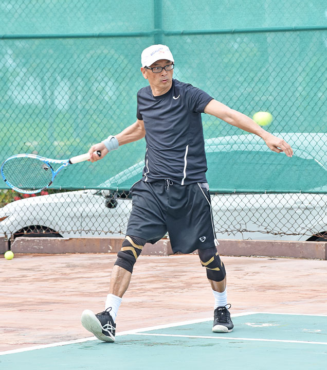 David Lai returns to Jeff Bristol during their finals match in the men’s singles 60 and over division.