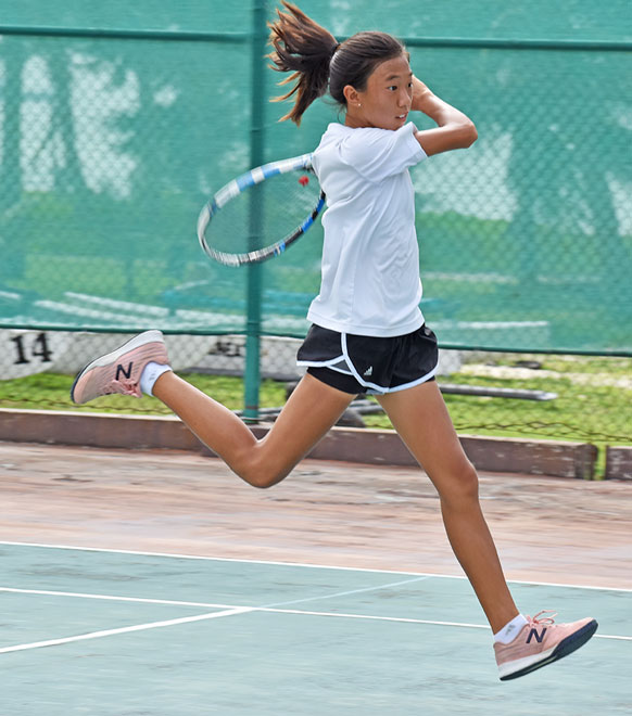 Savita Sikkel makes a backhand return to Helen Kim during their girls U14 singles game.