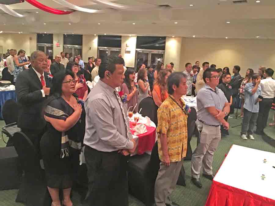 Guests stand up during the playing of the Philippine national anthem during the Vin d’ Honneur dinner last Saturday night at the Hibiscus Hall of the Fiesta Resort & Spa Saipan.