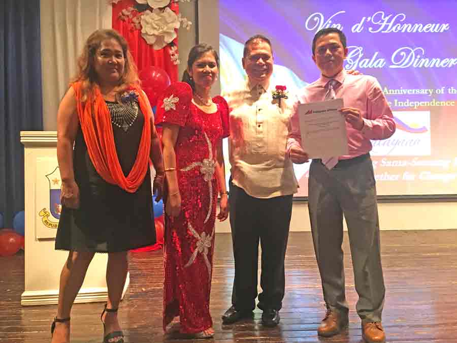 The winners to the raffle drawing during the Vin d’ Honneur pose for a picture with Philippine honorary consul to the Commonwealth Glicerio Arago, second from right, last Saturday night. From left to right, a guest, raffle winner Lin Digno, Arago, and Ferdinand Santos.