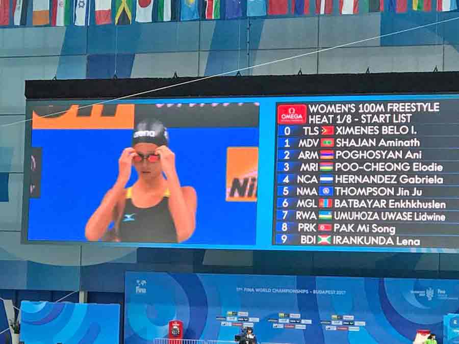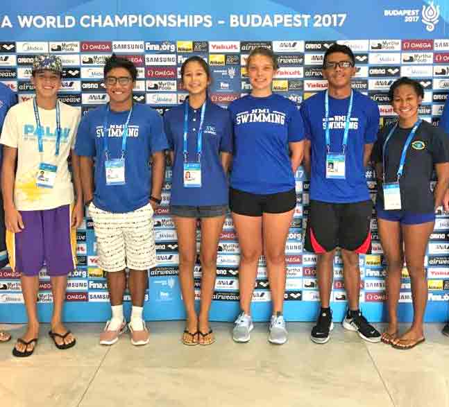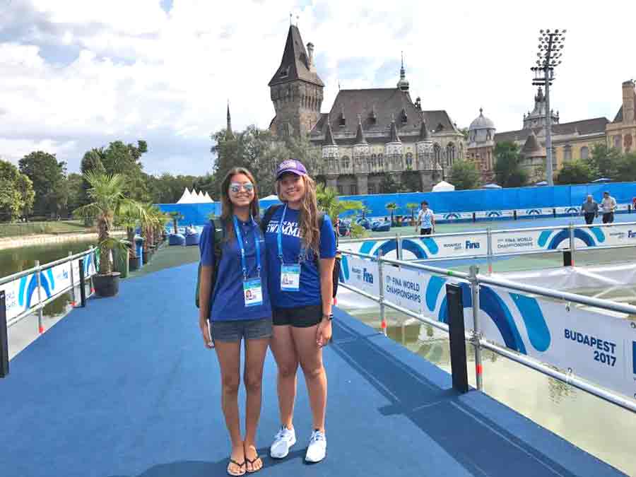 CNMI swimmers Jinju Thompson, left, and Victoria Chentsova pose for a photo in one of the sites they visited while waiting to compete in the 17th FINA World Championships last week in Budapest, Hungary.