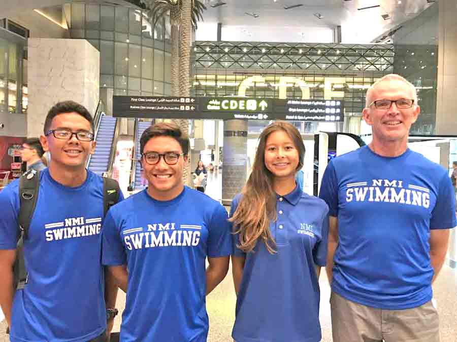 From left, Christian Villacrusis, David Boyer, Jinie Thompson, and coach Valrick Welch pose for a photo at the departure area of an airport in Doha, Qatar before leaving for their connecting flight to Hungary.