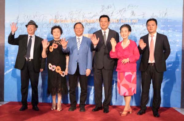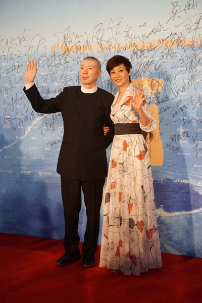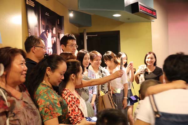 Country Far Away lead actor Yue Ma, lead actress Jun Xu, and the movie production crew join audience in a group photo during the festival movie screening at the Regal movie theater.