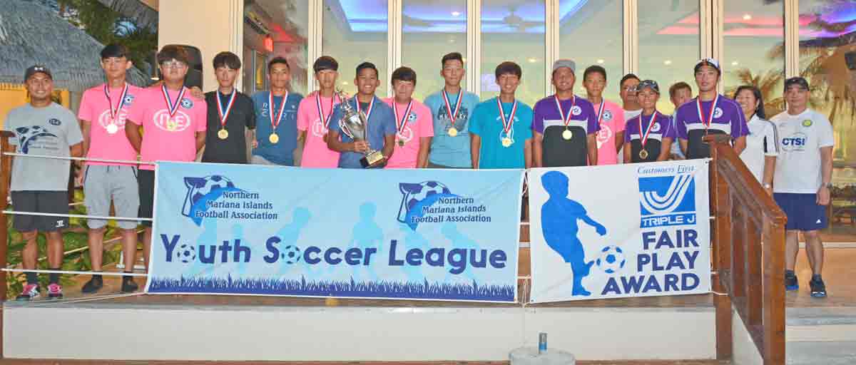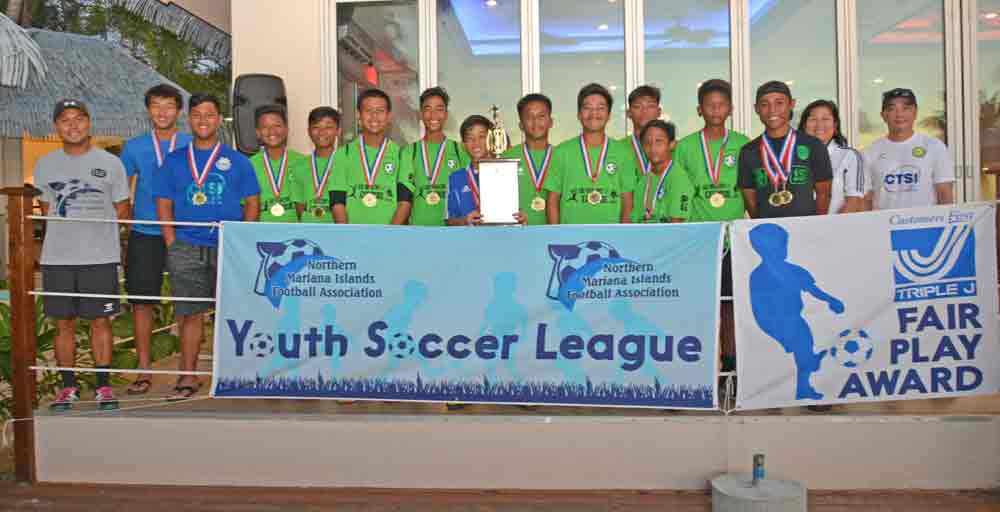 TanHoldings Boys U14 players and coaches pose with their medals and perpetual trophy during the awards ceremony for the 2016 NMIFA Youth Fall League last Saturday at the Surf Club in Chalan Kanoa. Also in the photo are league organizers and officials.