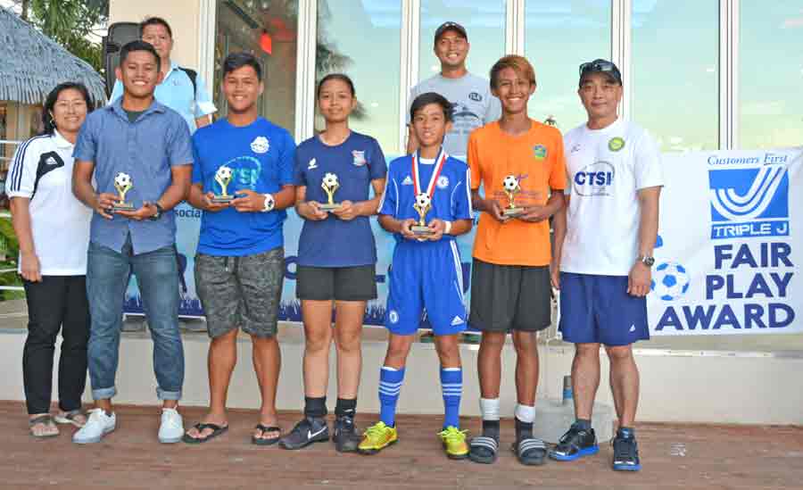 Triple J Fair Play awardees Sebastien Manabat, third left, Taro Goto, fourh left, Jerlyn Castillo, fifth left, and Joshua De Leon, seventh left, gather for a photo with league officials and Triple J Motors general manager Randy Steele after the trophy presentation.