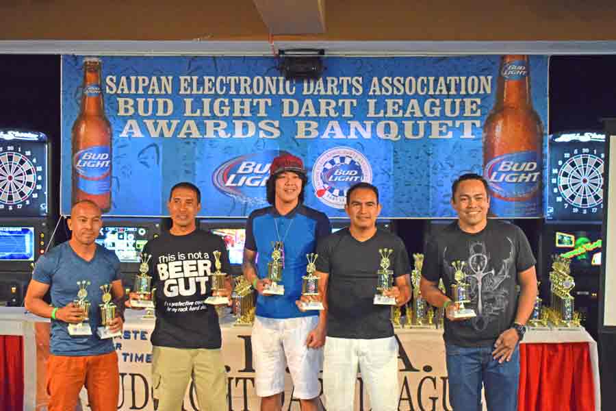 Gilbert “Hitman” Gatmaitan, right, bags two most valuable player trophies, Masters and A divisions, to lead the other recipients of the prestigious award in last Sunday’s Saipan Electronic Darts Association 2016 Winter/Spring season ceremony at Pacific Island Clubs’ Charley’s Cabaret