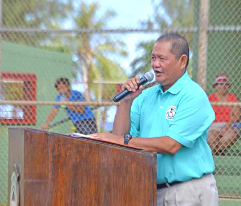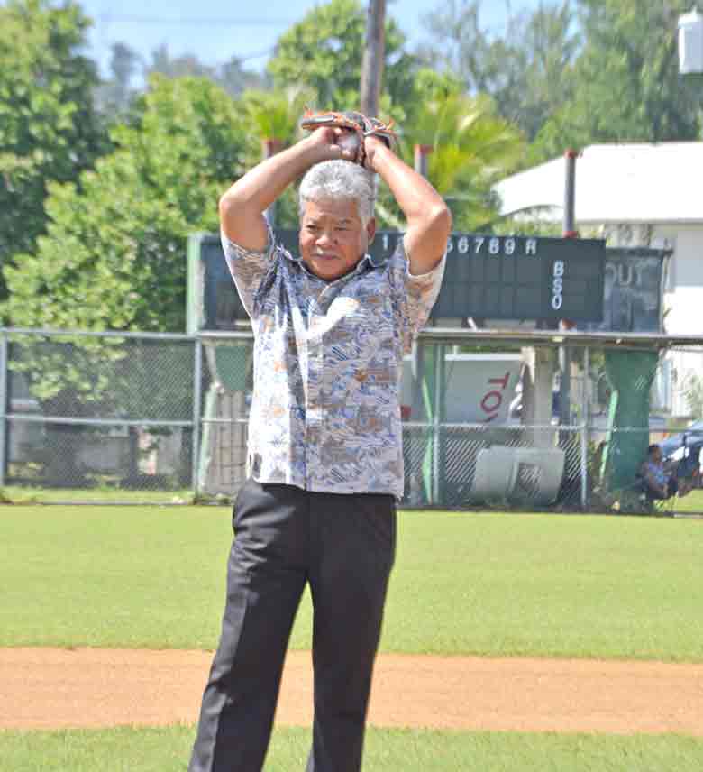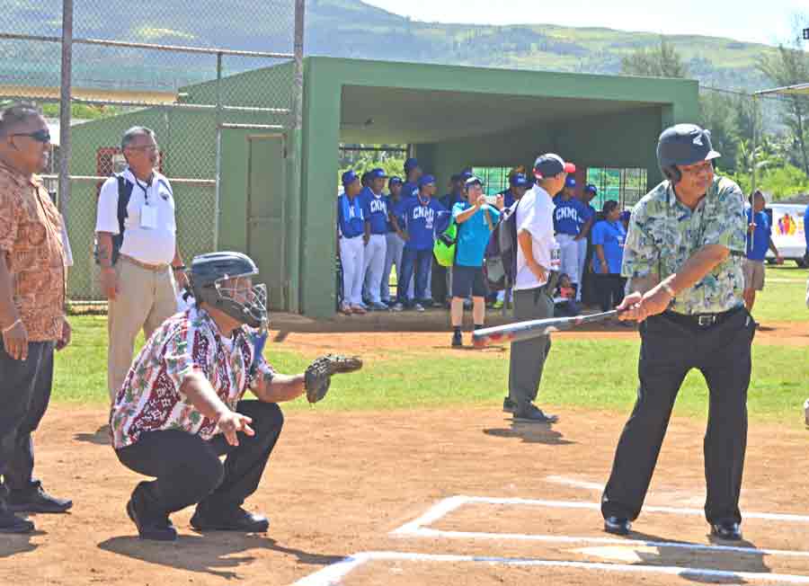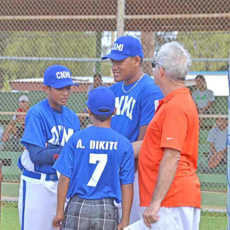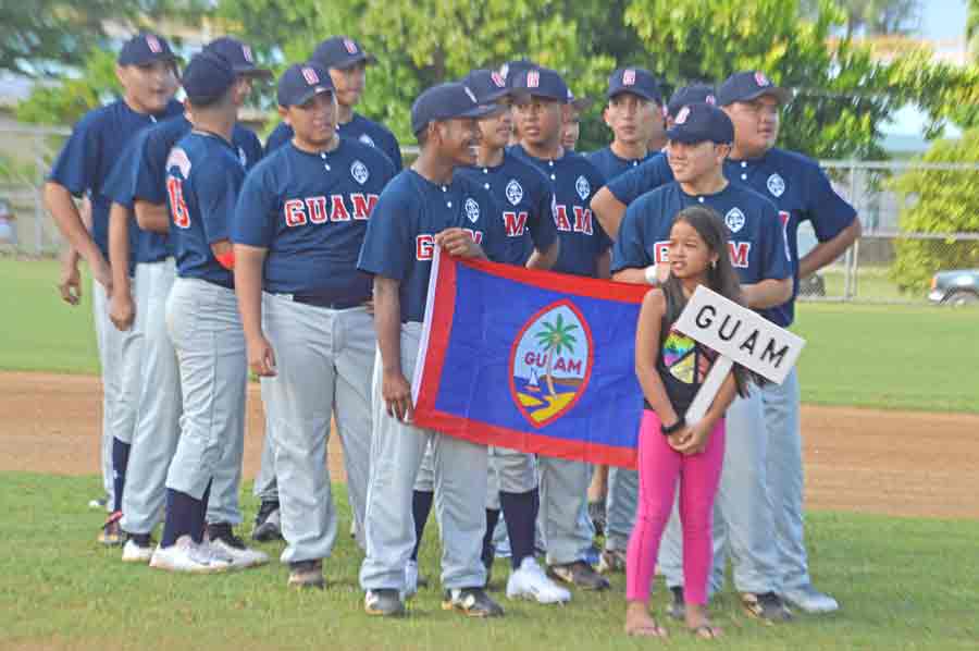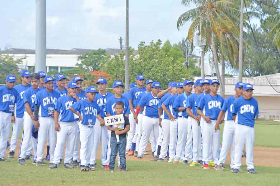 The CNMI Junior, left, and Senior All-Star Teams listen to the remarks of CNMI District Administrator James Ada during the opening ceremony for the 2017 Asia Pacific Middle East Regional Tournament last Friday at the Francisco “Tan Ko” Palacios Ballfield.