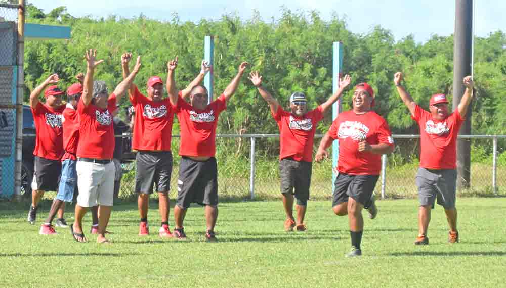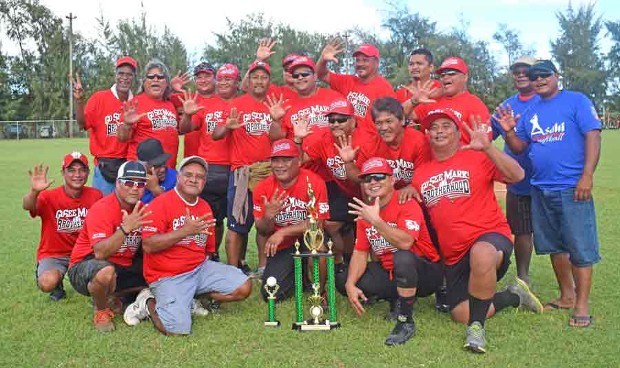 Brotherhood players and supporters pose for a group photo after winning the 2017 Belau Men’s Masters Softball League title last Sunday at the Dandan Softball Field.