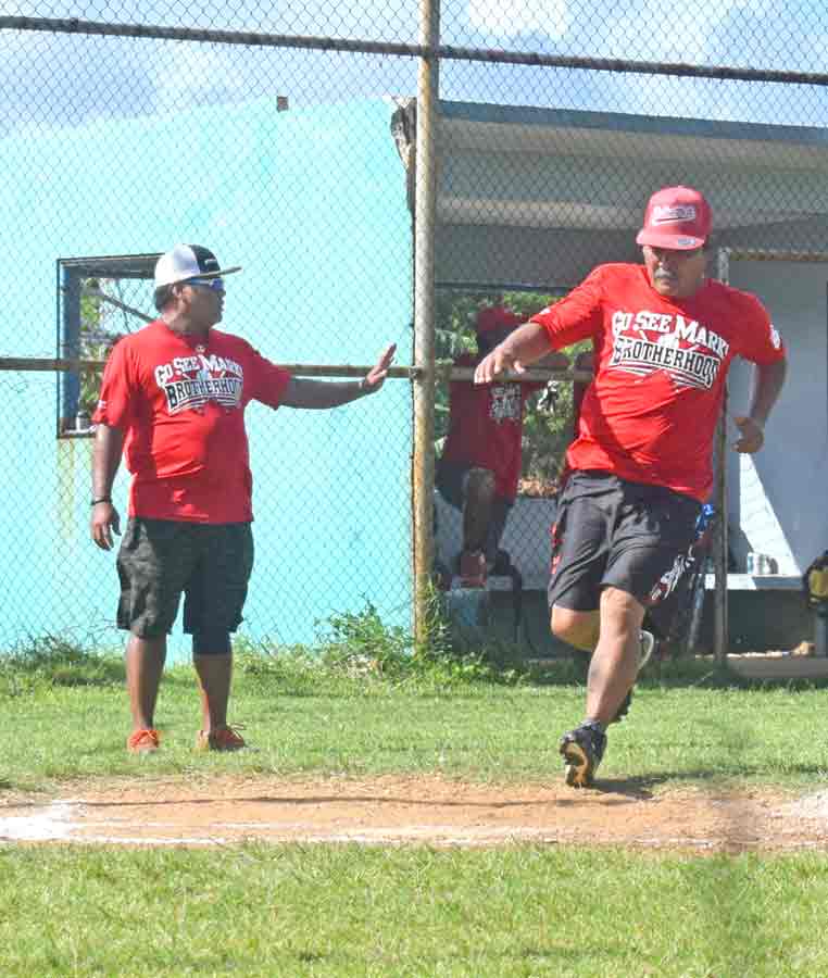 Peleliu’s James Fleming, center, runs toward home plate and is followed by teammate Mark Flores, right, while Brotherhood third baseman Bill Aguon waits for the relay throw.