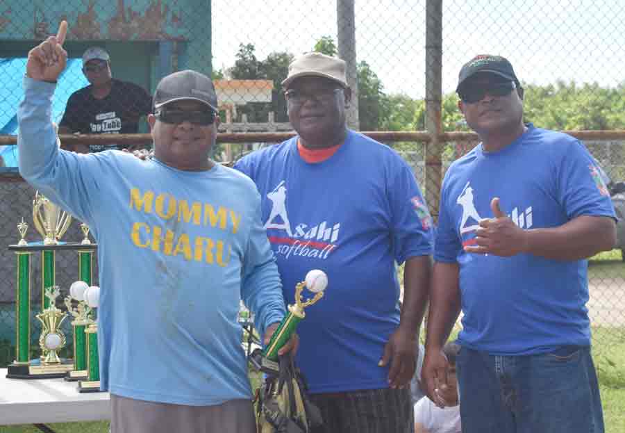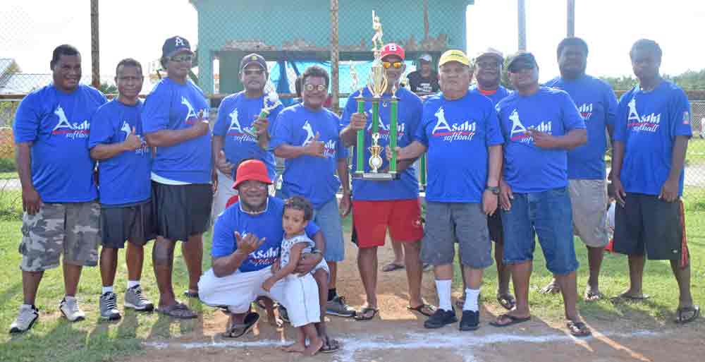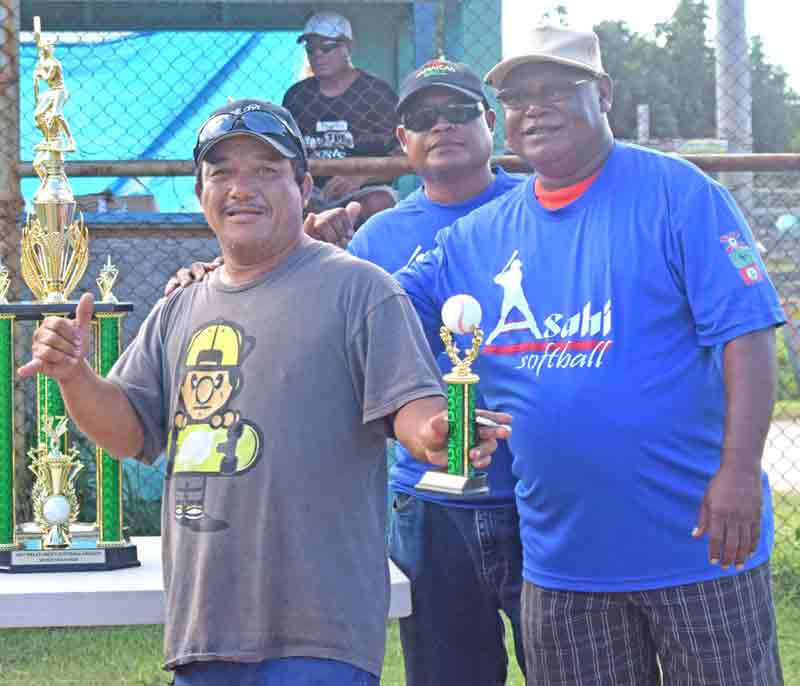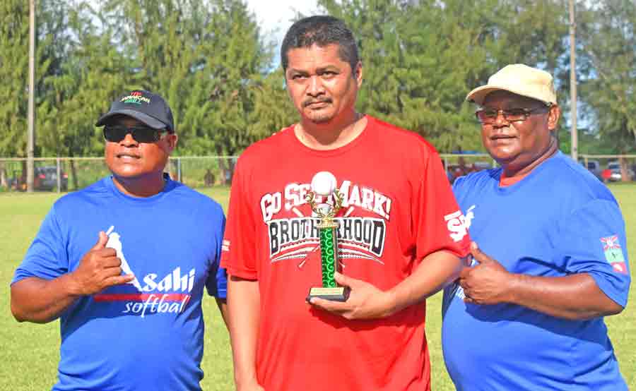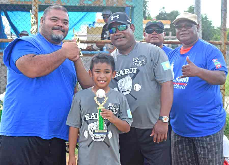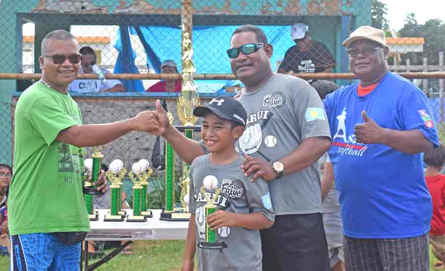 The Papa Bears’ Jojo Attao, left, shakes the hand of Karui’s Taylor Germance, third left, after receiving their individual trophies during the awards ceremony for the 2017 Belau Men’s Masters Softball League last Sunday at the Dandan Softball Field. Attao was the league’s batting champ, while Germance won four awards, including the regular season most valuable player.