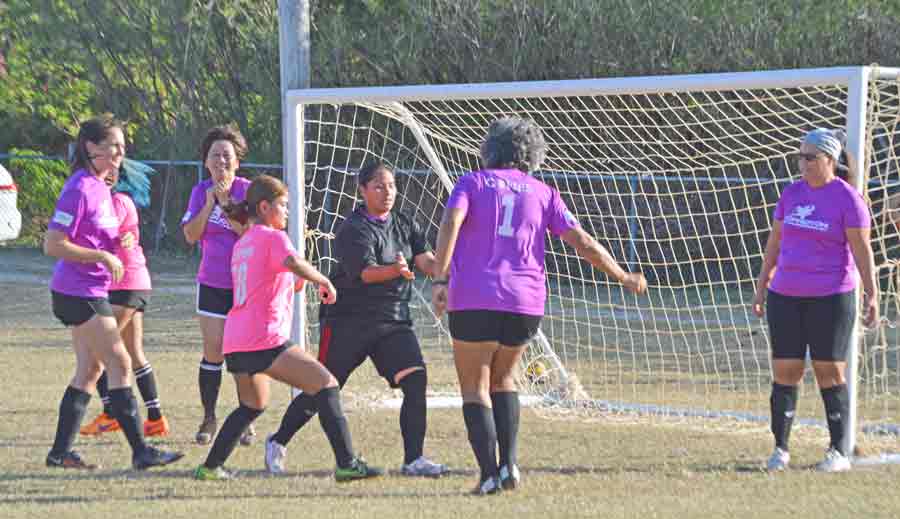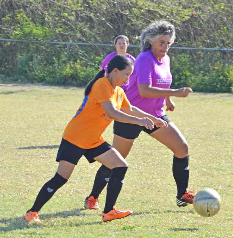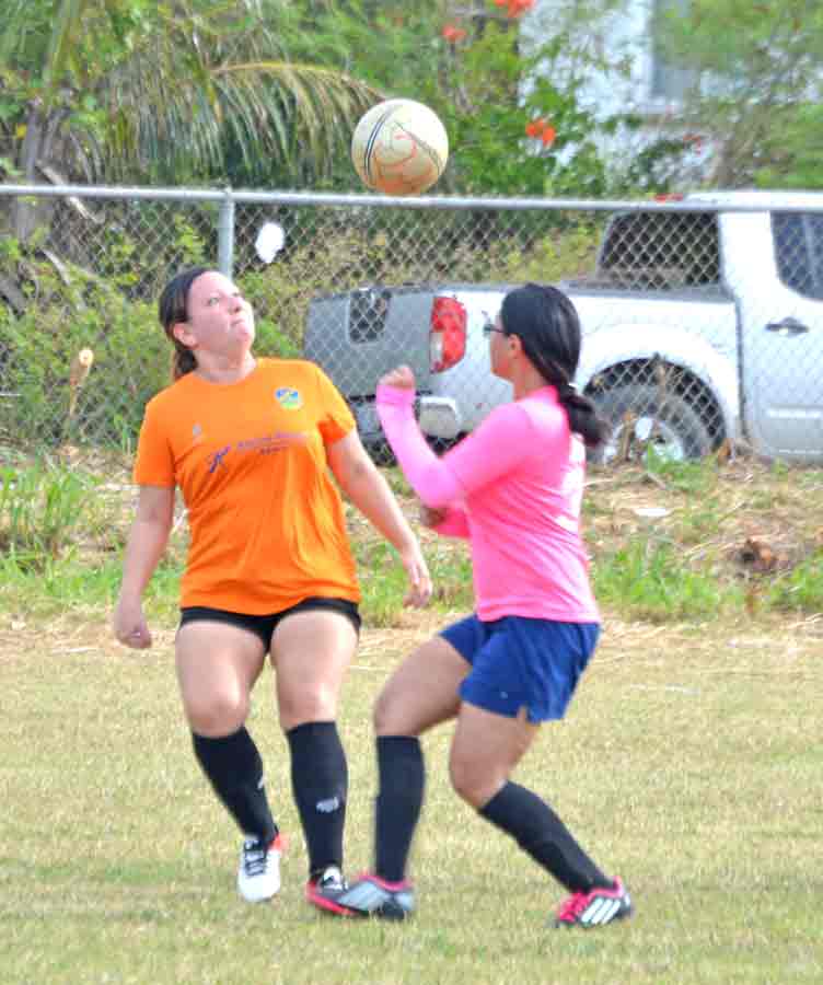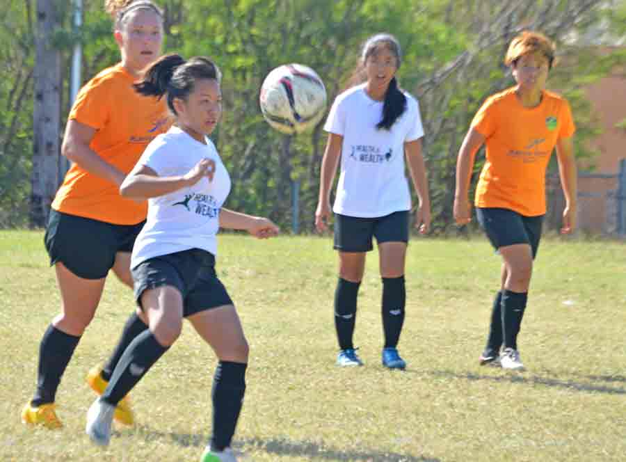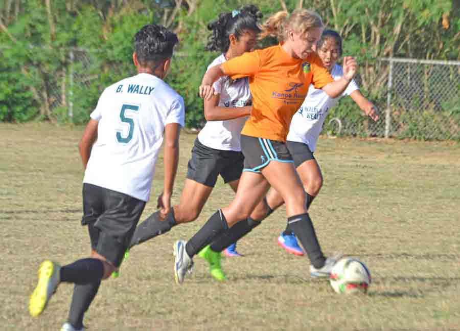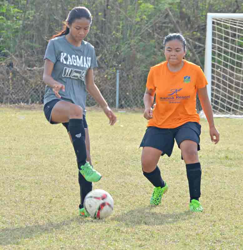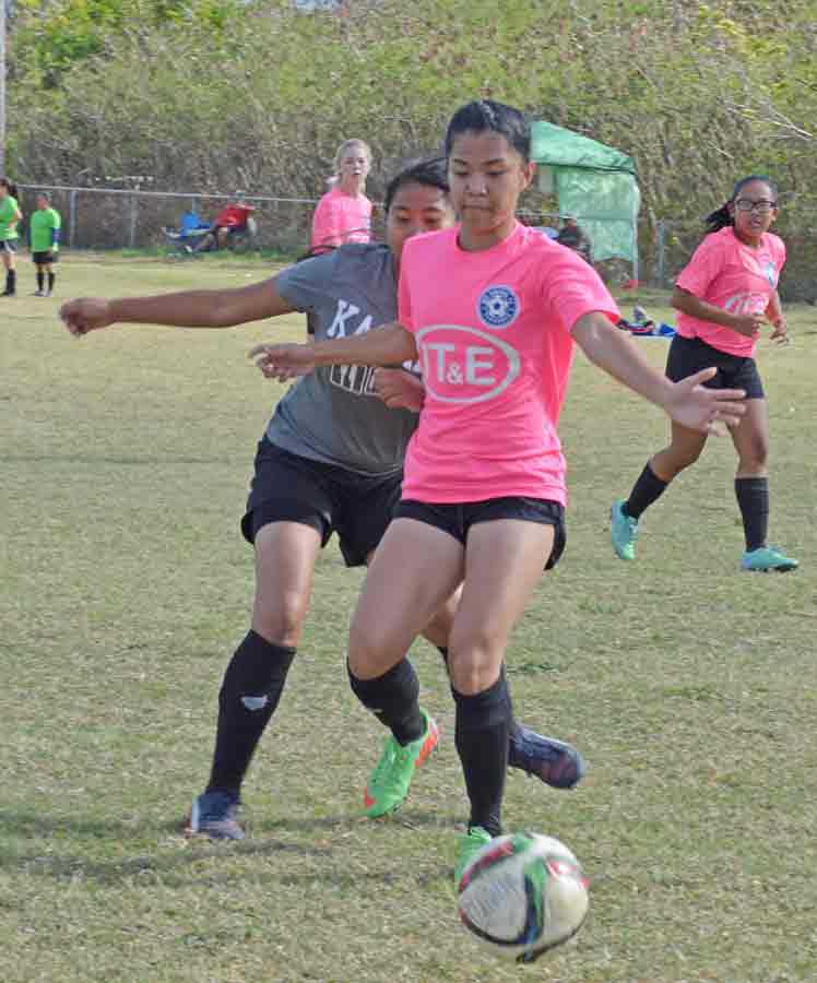 A Kagman High School player, left, stops the ball, while a Kanoa FC player steps in for defense during their Division B game in the 2017 Dove Women’s Spring League at the Chacha Oceanview Middle School Field.