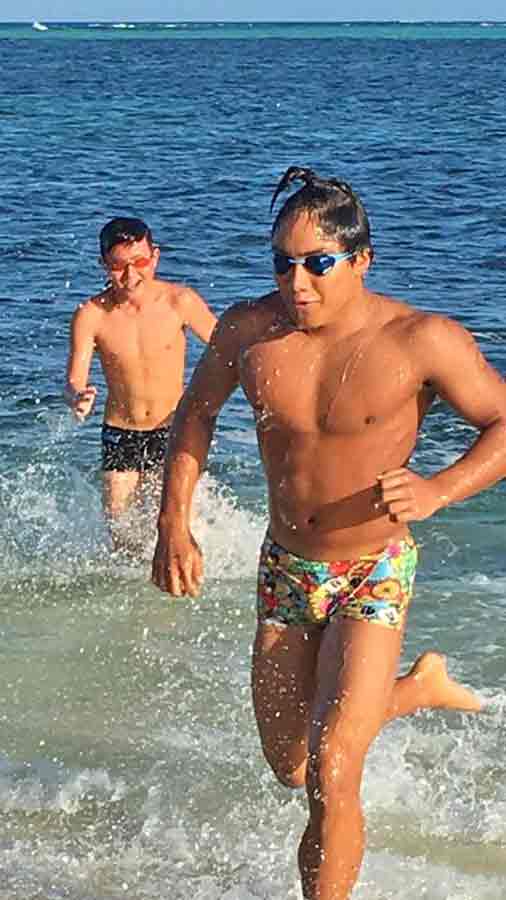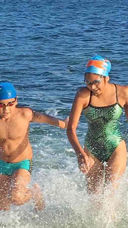 Lennosuke Suzuki runs out of the water to finish the 2.4-kilometer crossing from Managaha to Micro Beach.
