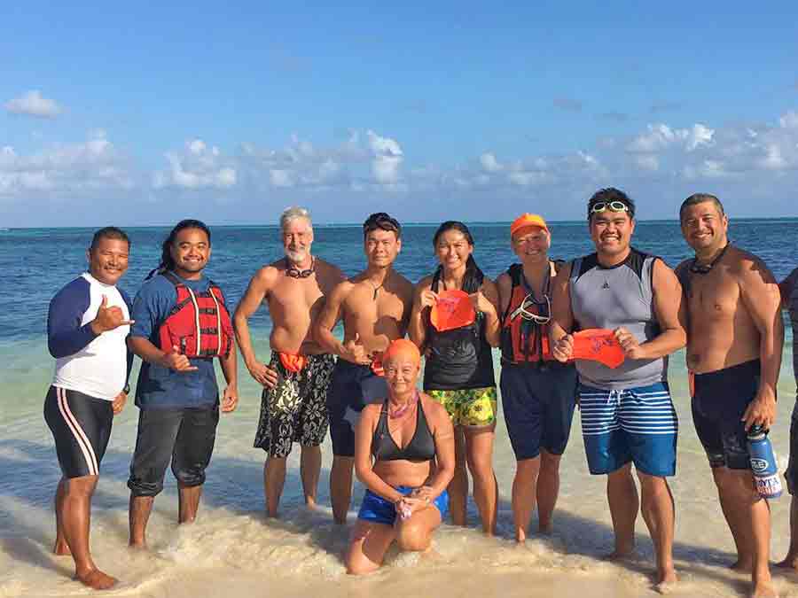 Four swimmers walk their way to the Smiling Cove Dock to ride a boat to Managaha.