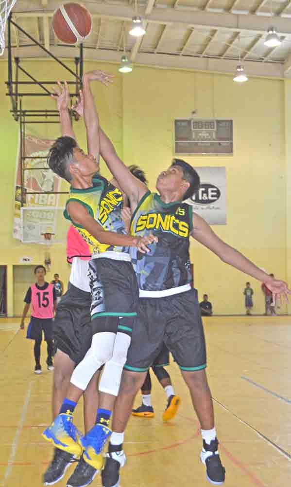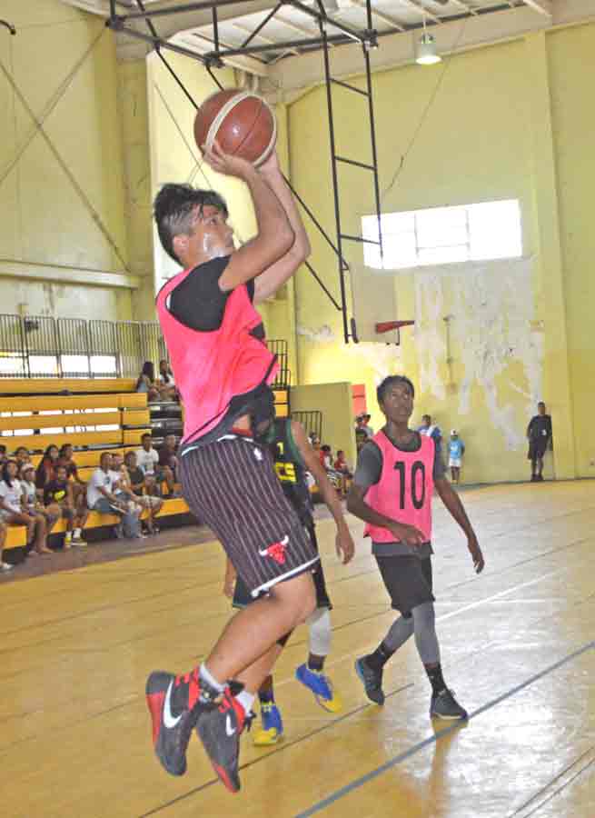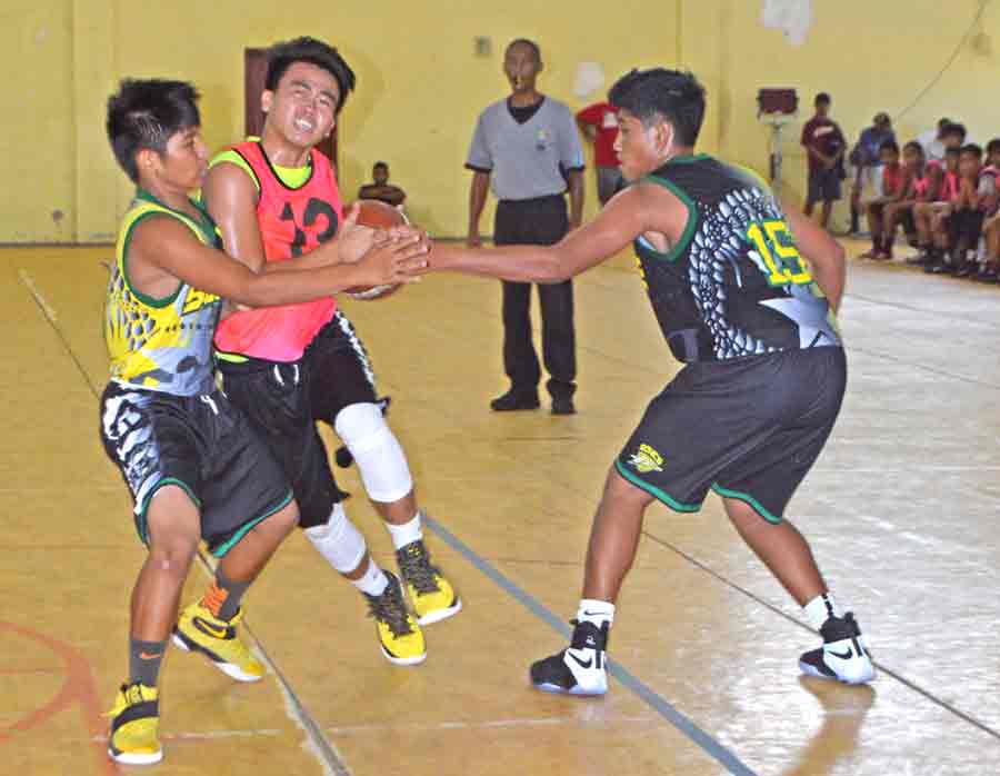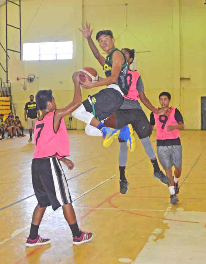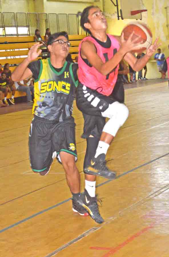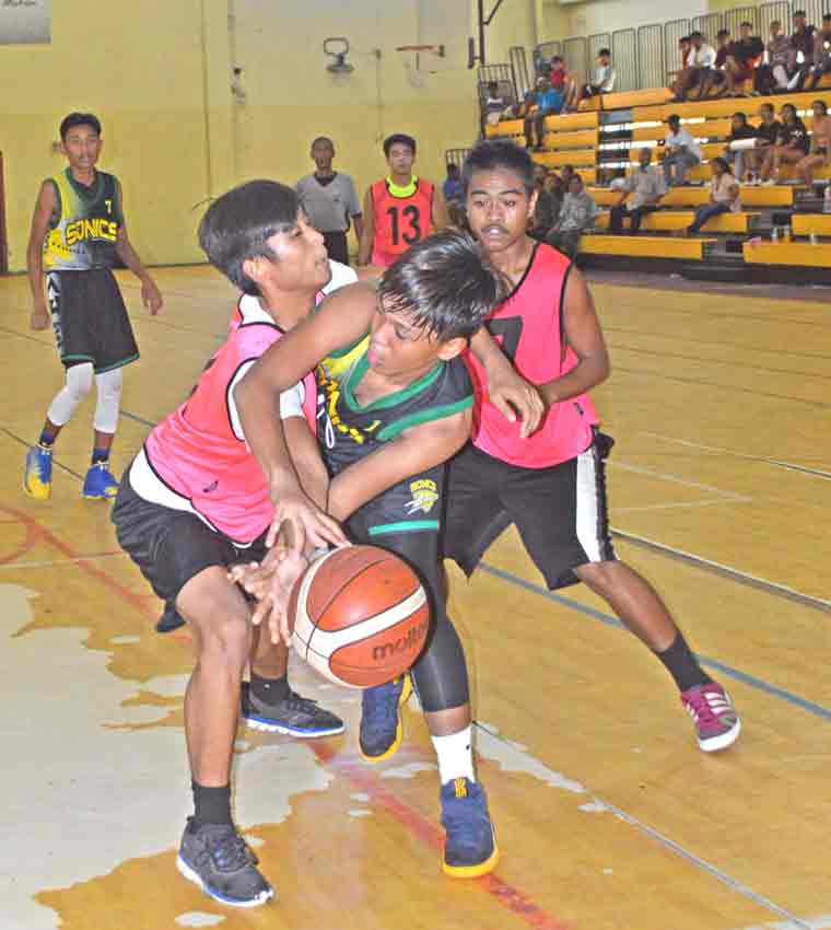 The 670 Sonics/PHI’s Khristian Itaas goes up for an acrobatic shot against the Ol’Aces Elite’s Albert Atan, left, and Andreu Omelau during the first half of their boys U15 division title game in the 2017 Francisco M. Diaz Memorial Youth League last Friday at the Gilbert C. Ada Gymnasium.