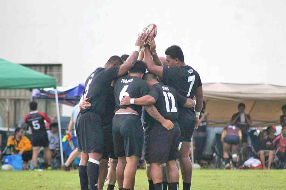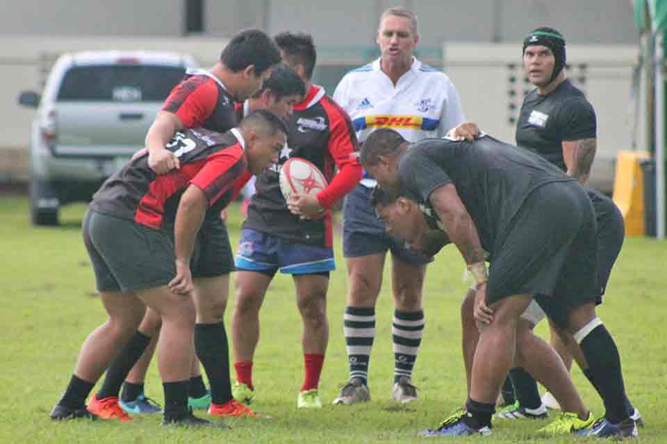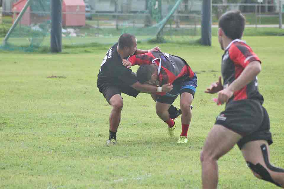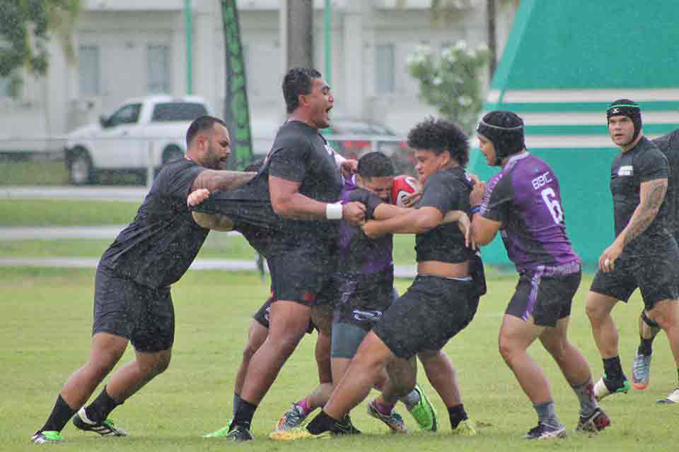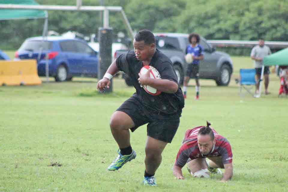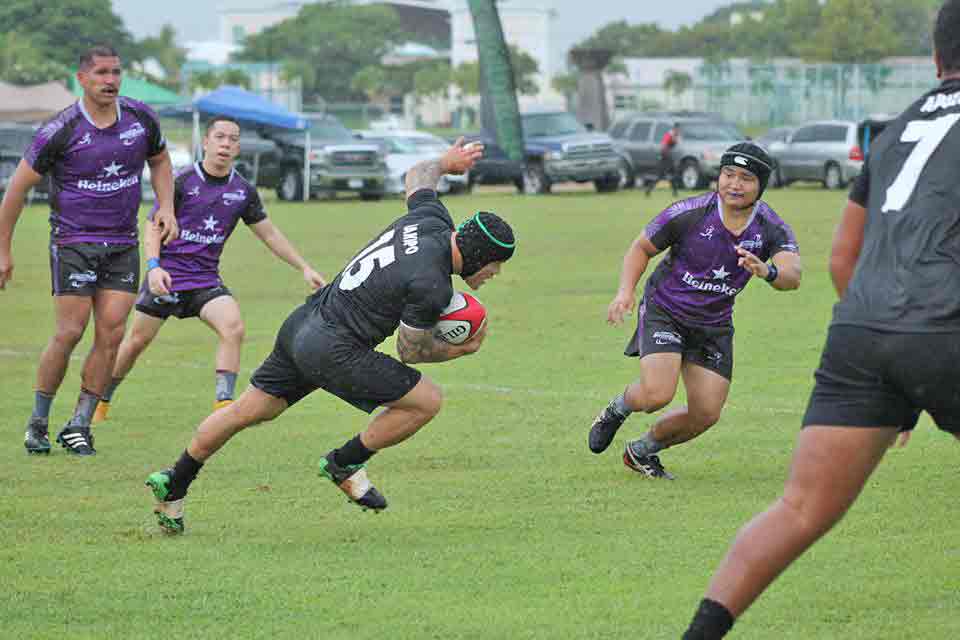 The CNMI’s Kelvin Fitial holds his ground against a tackle from The Alliance defender during their game in the 2017 Heineken Guam Rugby Sevens held at the University of Guam Calvo Field House in Mangilao last weekend.