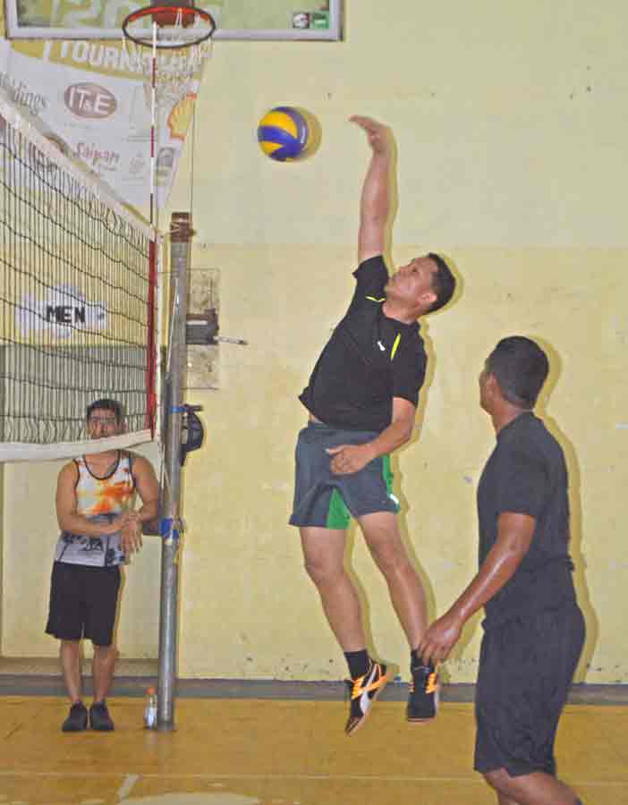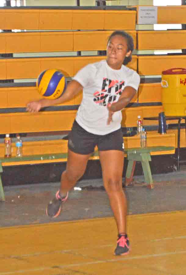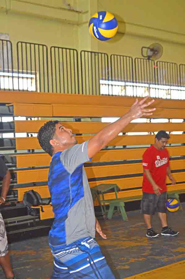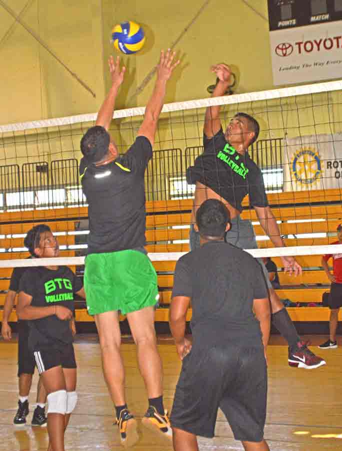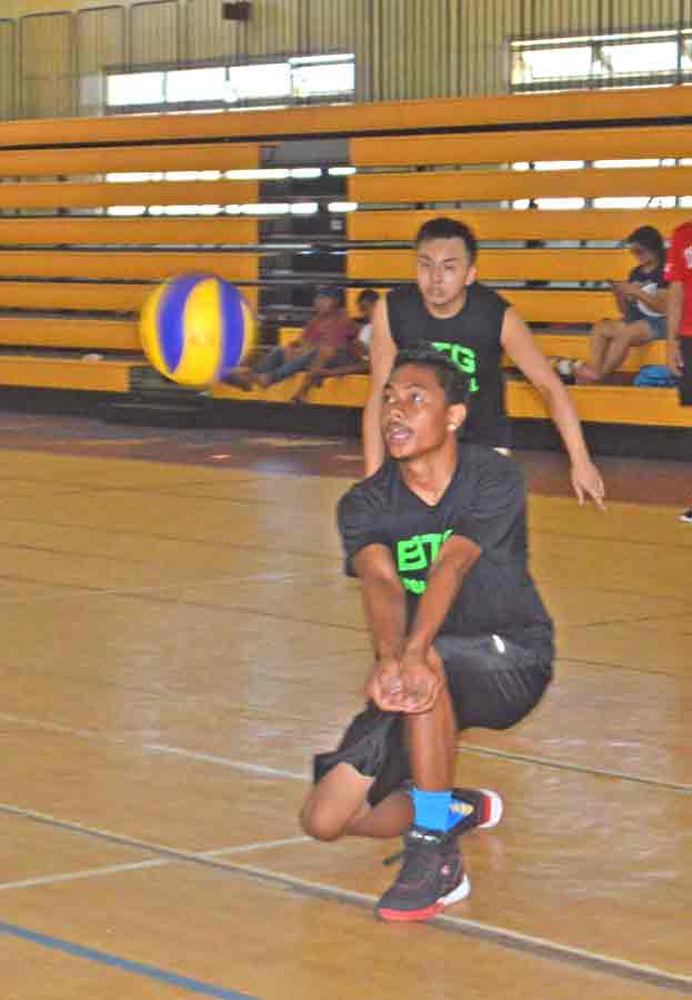 A BTG player bends down to receive a serve from Holy Sett during their game in the 2017 Micronesian Baseball Classic Fundraising Volleyball Tournament last Saturday at the Gilbert C. Ada Gymnasium.