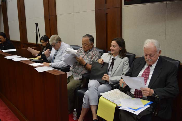 From left, Nicole Ripple, James Sirok, Jesus Borja, Jennifer Dockter, and William Fitzgerald served as judges in the CNMI mock trial competition last Friday.