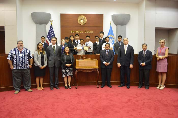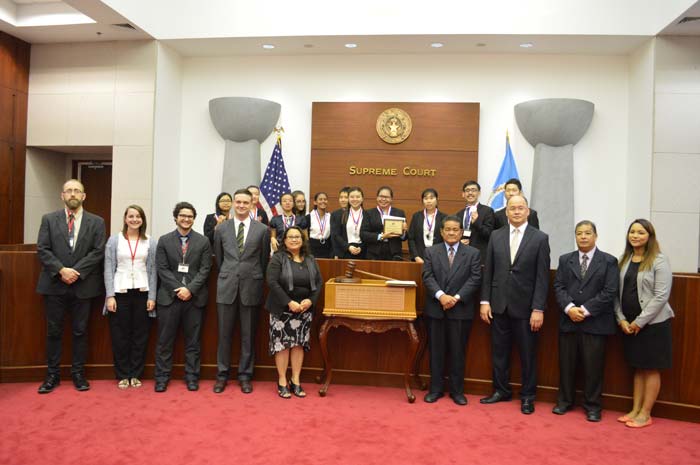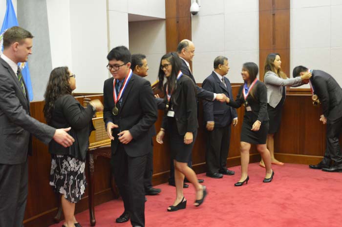 Students of the Mount Carmel School mock trial team line up as they receive their first place medals for winning the CNMI mock trial competition 2017 last Friday.
