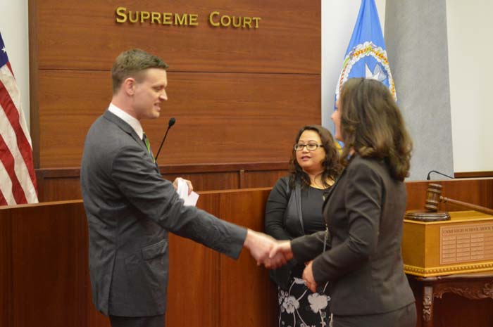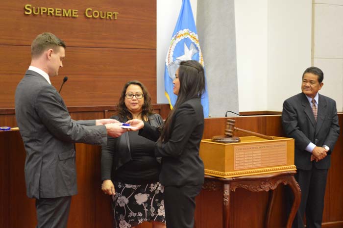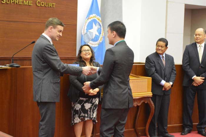 Charles Brasington, left, and Associate Commissioner Lynette Villagomez congratulate Saipan International School’s Shea Hartig, who got an honorable mention as best prosecution attorney.