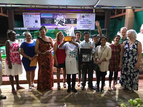 Fiesta Resort & Spa Saipan’s Vicente Montoya, second from left, poses for a photo after being awarded third place during the 2017 Next Top Chef competition last Thursday at the Fiesta Resort & Spa Saipan. (Kimberly A. Bautista)