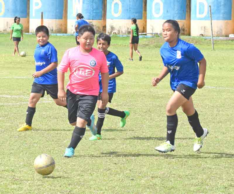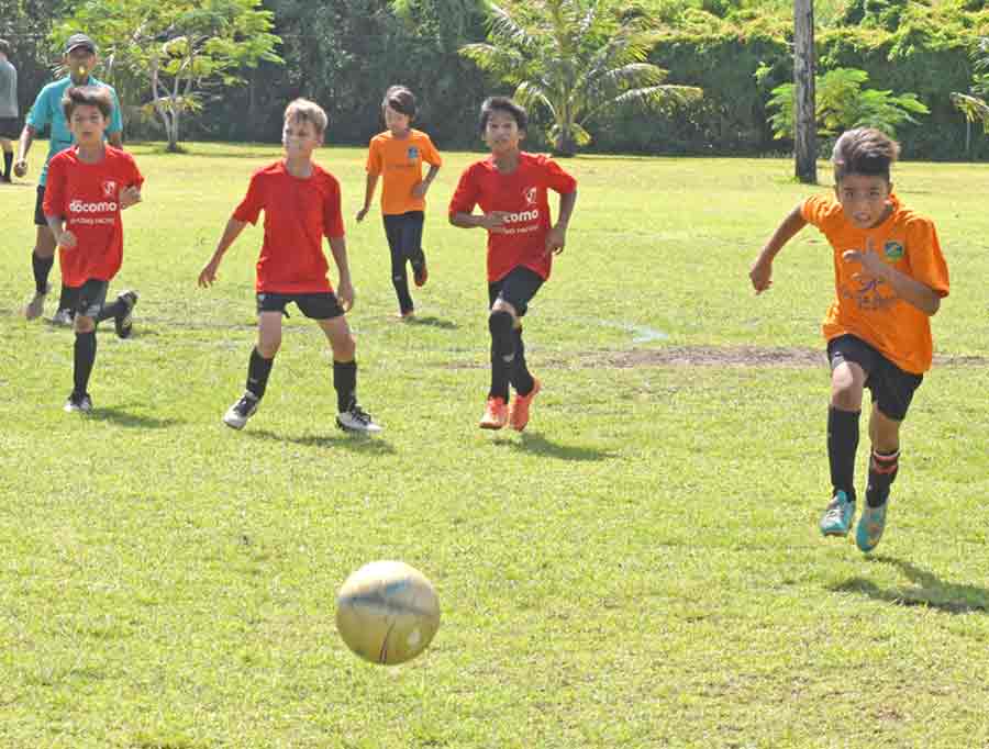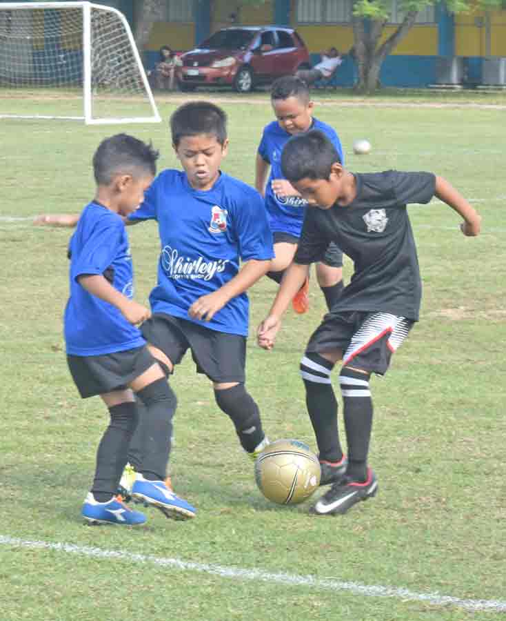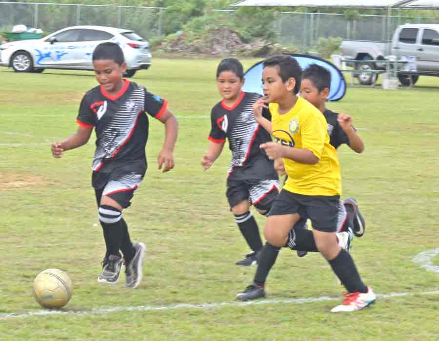 A Southern United FC player, right, battles two members of Shirley’s FC for possession during their coed U8 game in the 2017 NMIFA Fall Youth League Festival held last Saturday at the Hopwood Middle School Field.