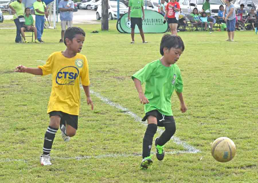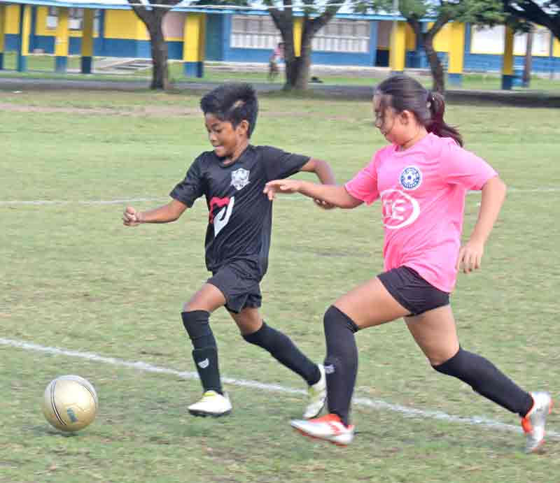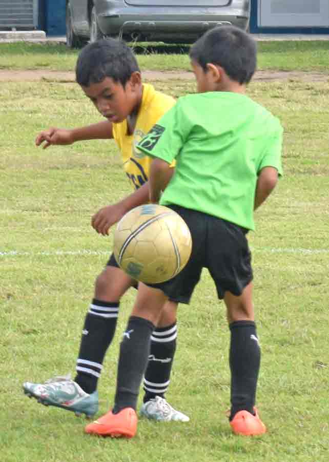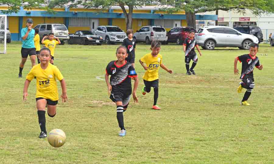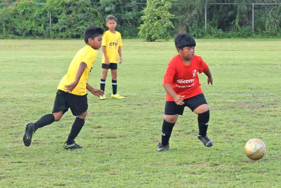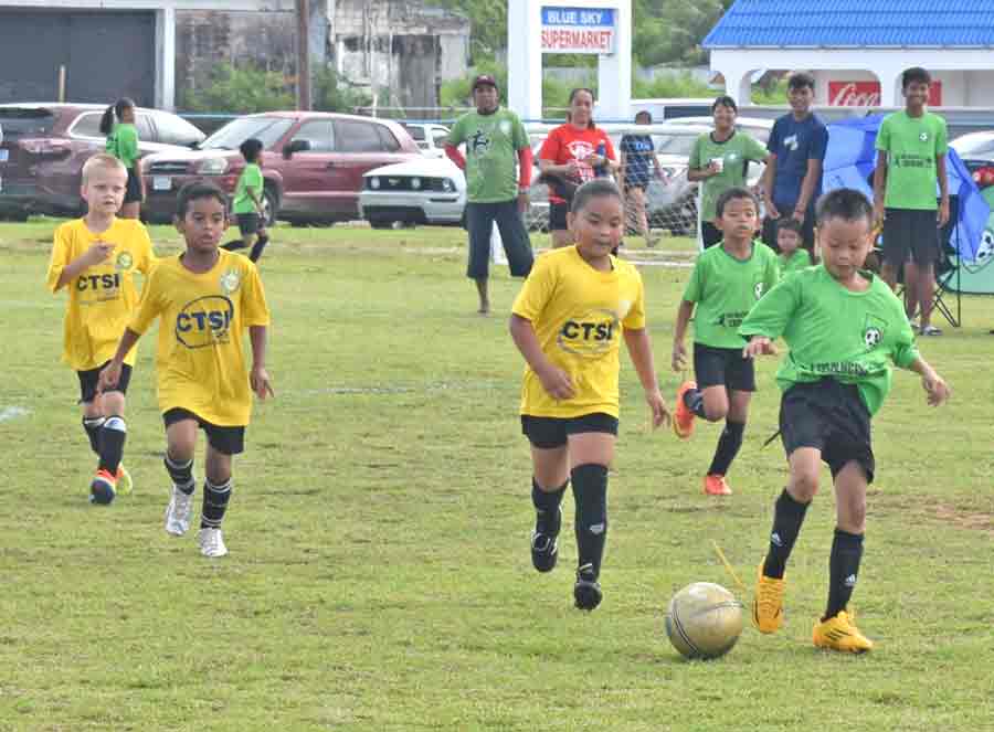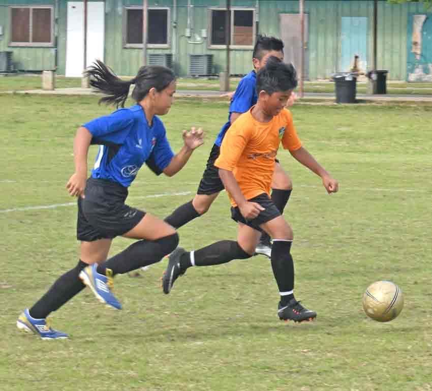 Two Shirley’s FC players, left, try to block the ball, while a Southern United player attempts for a kick during their coed U8 game in the 2017 NMIFA Fall Youth League Festival held last Saturday at the Hopwood Middle School Field.