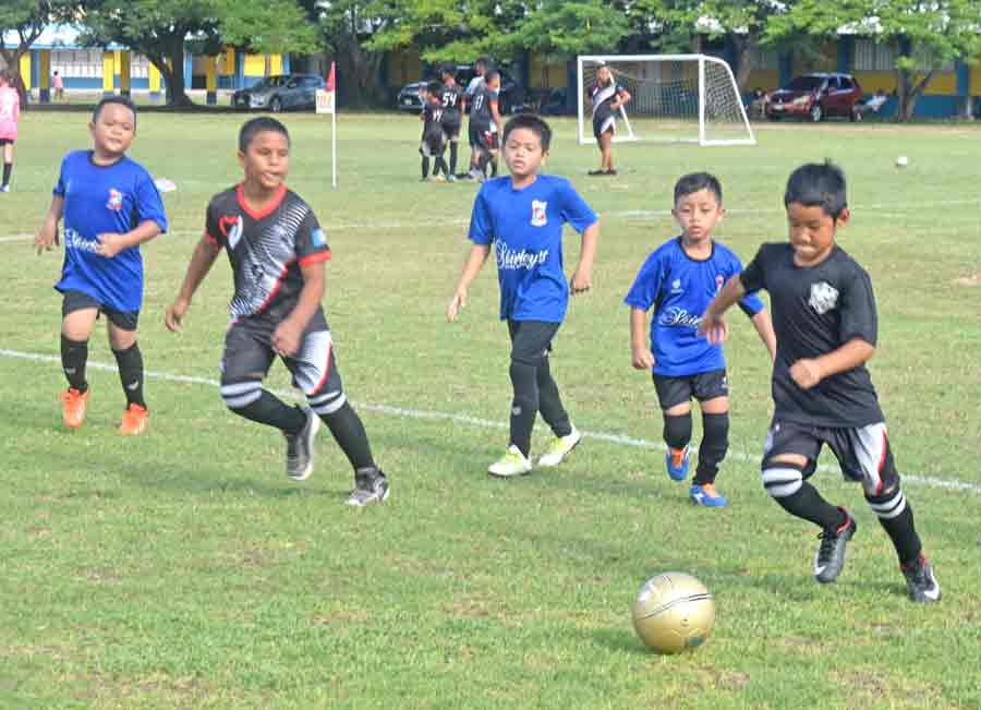 TanHoldings’ Nathan Perez, third left, dribbles past a Matansa player, second left, while his teammates Kian Estolas, left, and Kay Anne Costales try to catch up on the play.