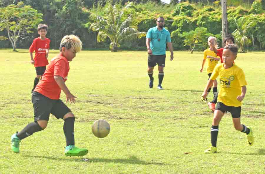 A Southern United player, right, follows the ball, while Shirley’s FC defenders chase him during their coed U8 game in the 2017 NMIFA Fall Youth League Festival at the Hopwood Middle School Field.