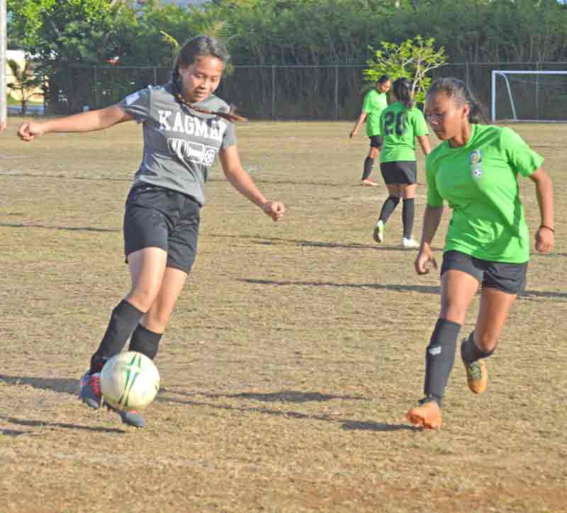 A Saipan Southern High School player, right beats Marianas High School’s Diana Maniacop to the ball during the first half of their girls division championship game in the 2017 NMIFA-PSS High School Interscholastic Football League held late last month at the Hopwood Middle School Field.