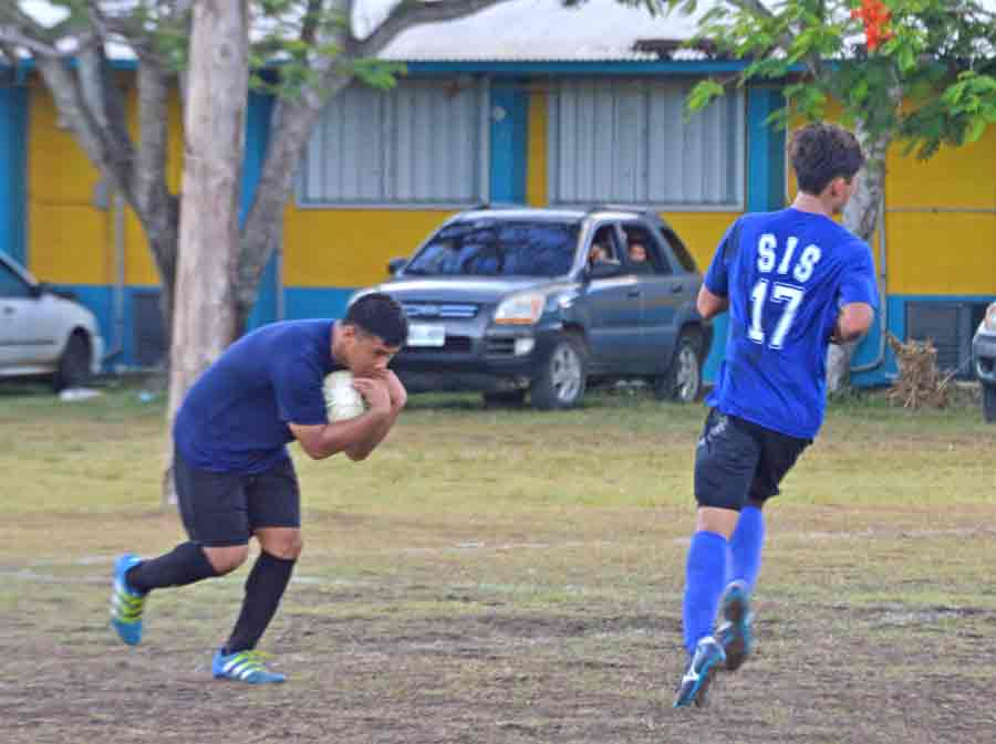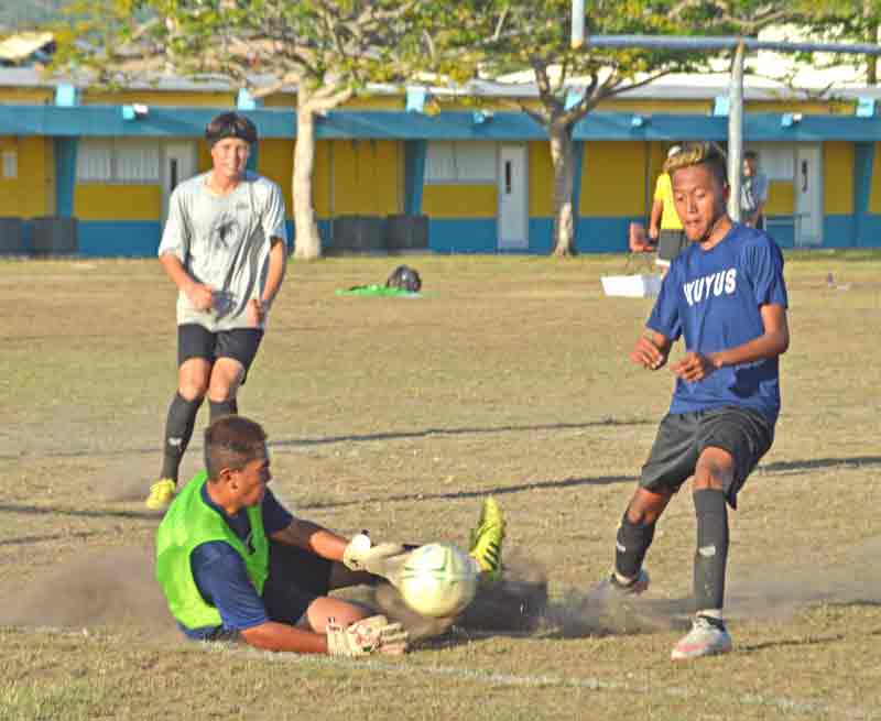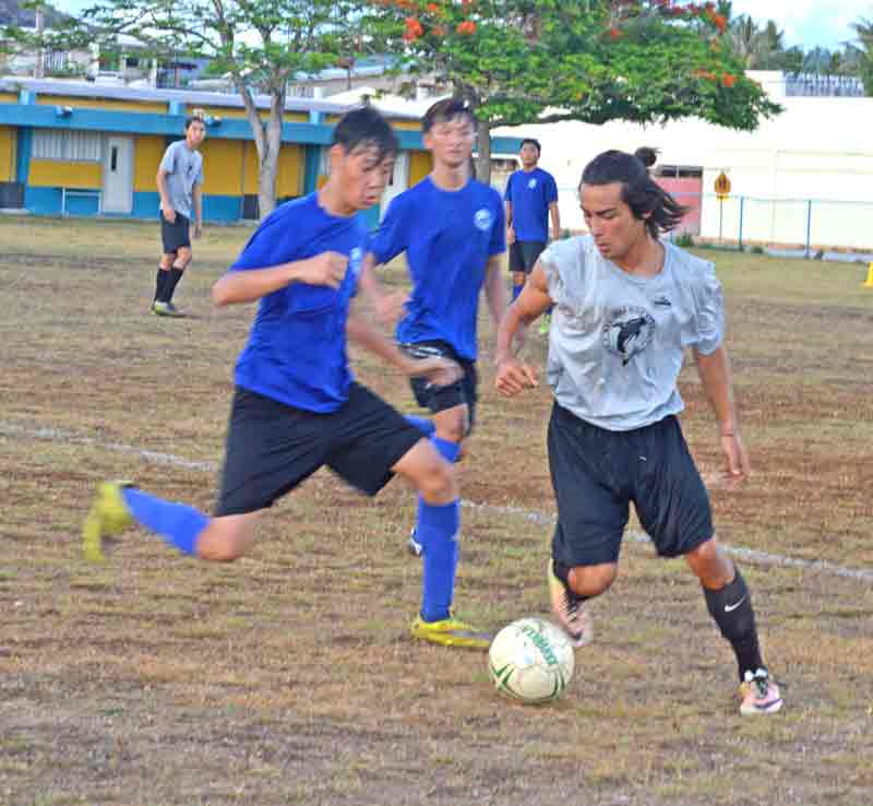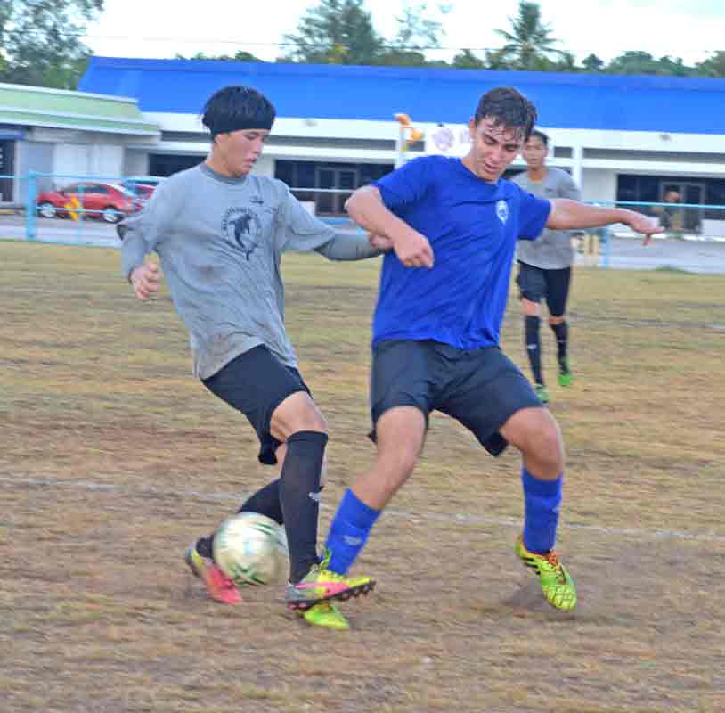 A Kagman High School player, left, dribbles past Marianas High School’s Evan Belcher during their semis game in the boys division of the 2017 NMIFA-PSS High School Interscholastic Football League last Friday at the Hopwood Middle School Field.