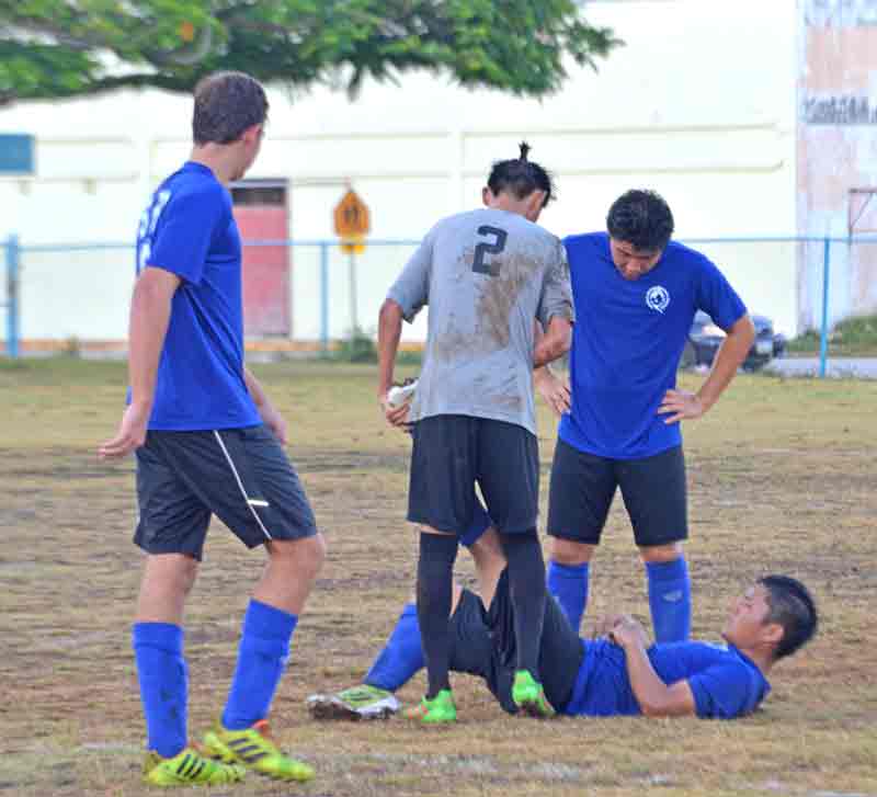 Marianas High School and Saipan International School players check on the condition of the Geckos’ Clayton Izuka during the second half of their title game.