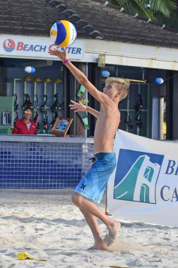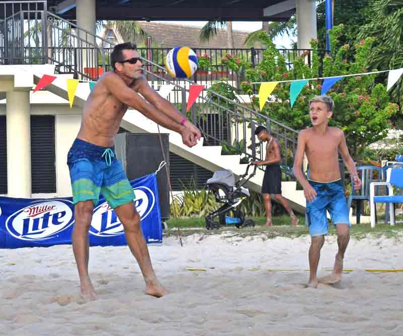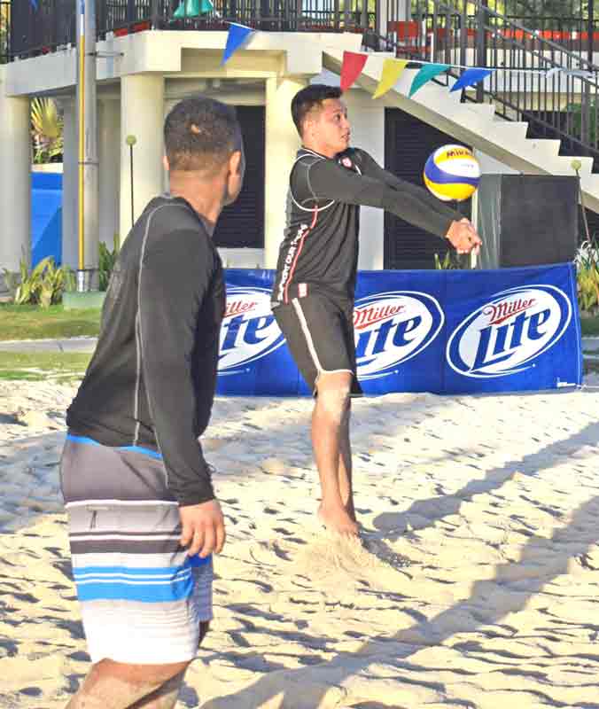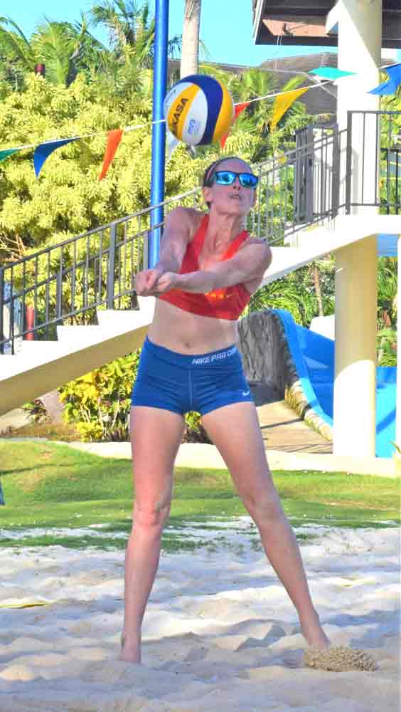 A player goes for a spike during the knockout phase of the Pacific Islands Club Saipan 4-Person Coed Beach Volleyball Tournament held last Saturday on the sand courts of the San Antonio hotel.
