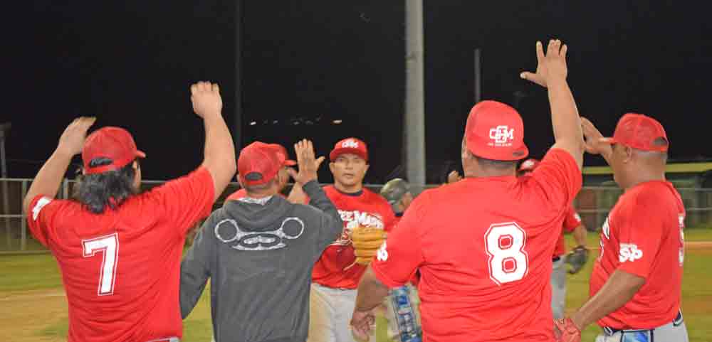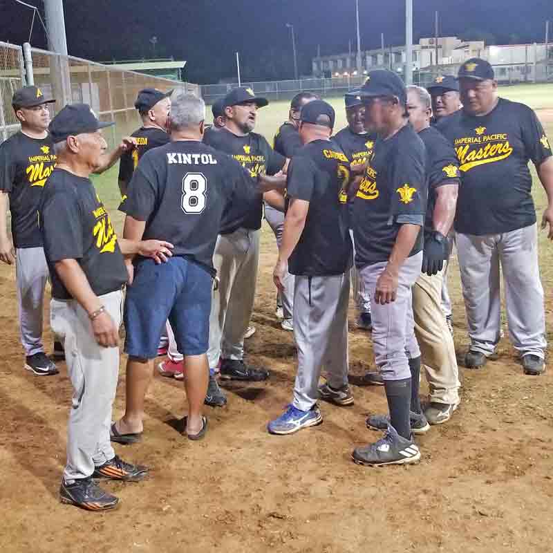 The IPI Masters huddle to celebrate their win against the Papa Bears in the battle for third place in the Masters division of the 2017 Saipan Baseball League last week at the Francisco M. Palacios Ballfield.