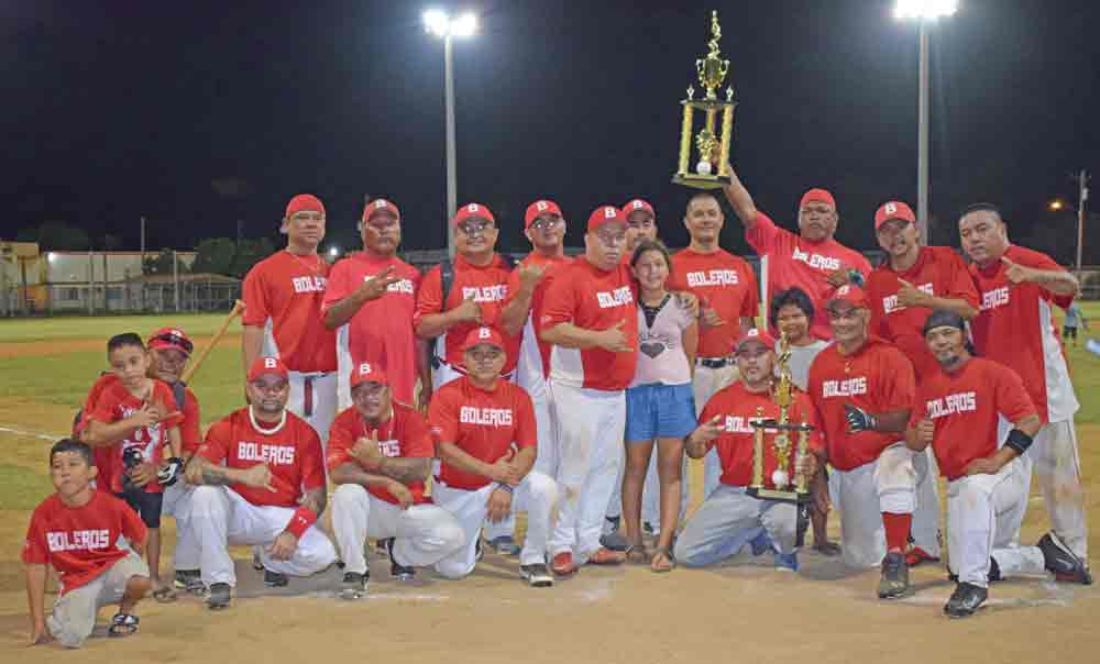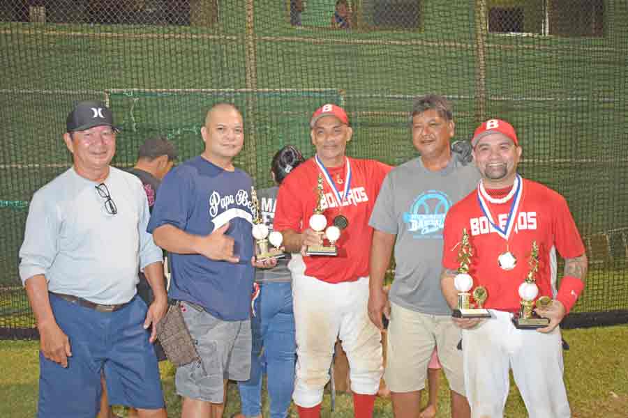 The Papa Bears’ Glen Camacho, second left, and Mike Guerrero, third left, and the Boleros’ James Fleming, right, pose with their triples champion trophies.