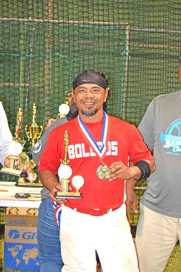 The Boleros’ Justin Reyes shows his trophy and medal after being named as one of the home run champions, tying Saisei’s Hector Efraim and Joe Torres of the IPI Masters.