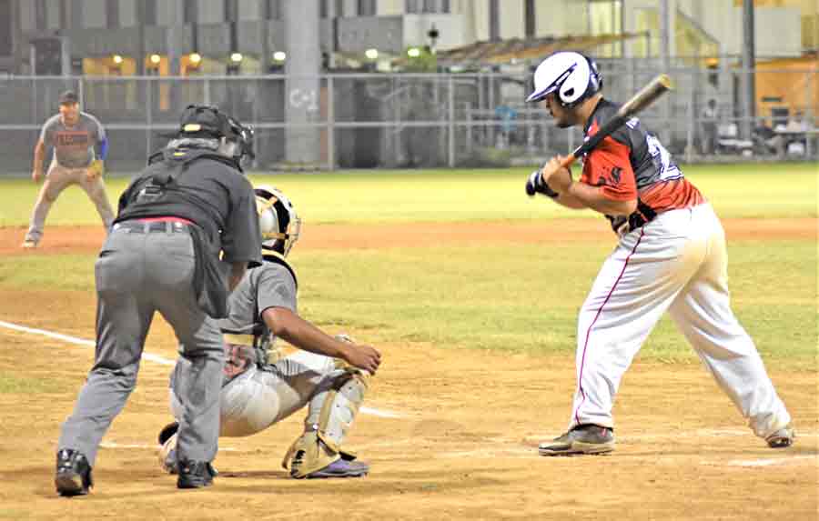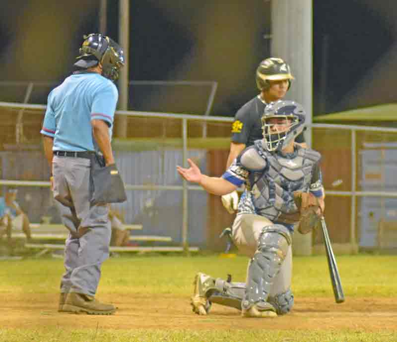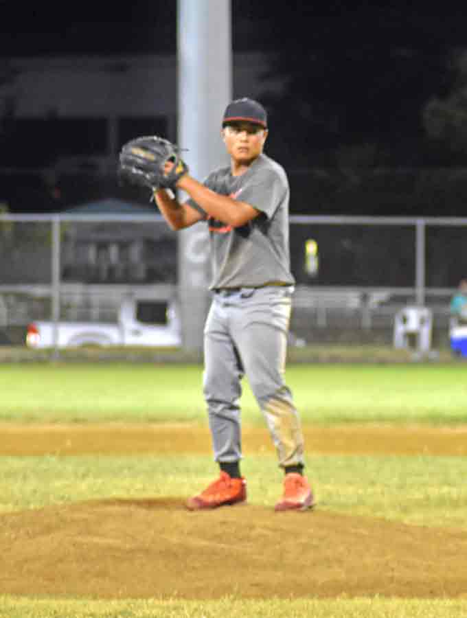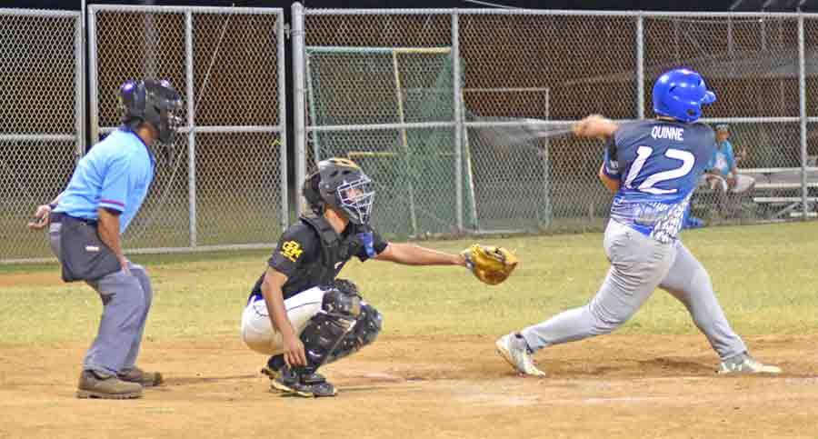 The GSM Cubs’ Keoni Kaipat is caught looking for a strike in one of his four plate appearances against Tanapag Falcons pitcher J.J. Lifoifoi during their title game.