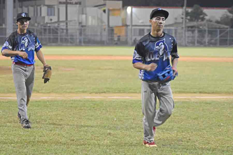 The Blue Jays huddle before the start of the ninth inning of their battle for third place game against the IPI Pirates in the Saipan Baseball League’s Under 25 division last week at the Francisco M. Palacios Ballfield.