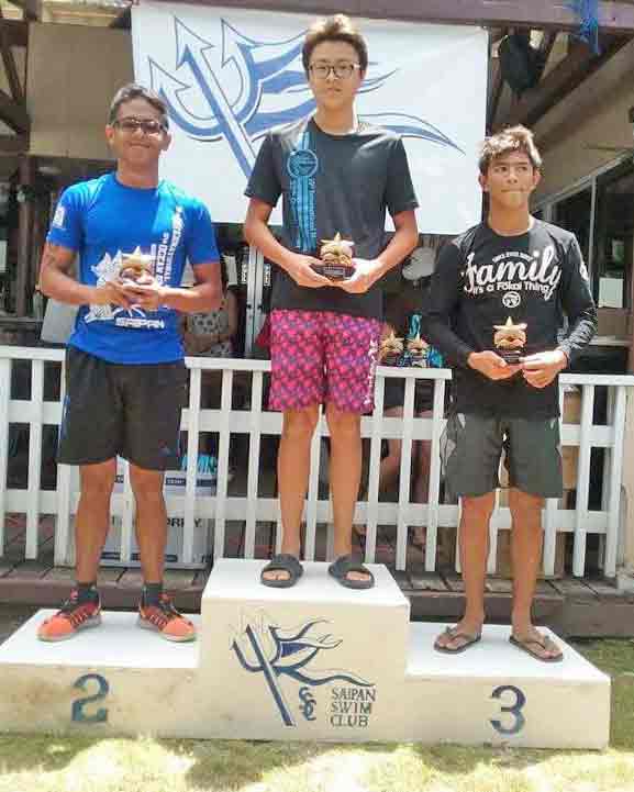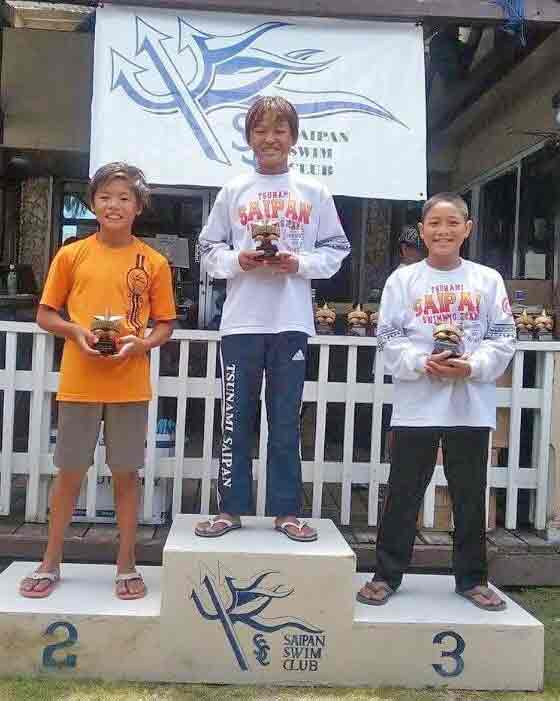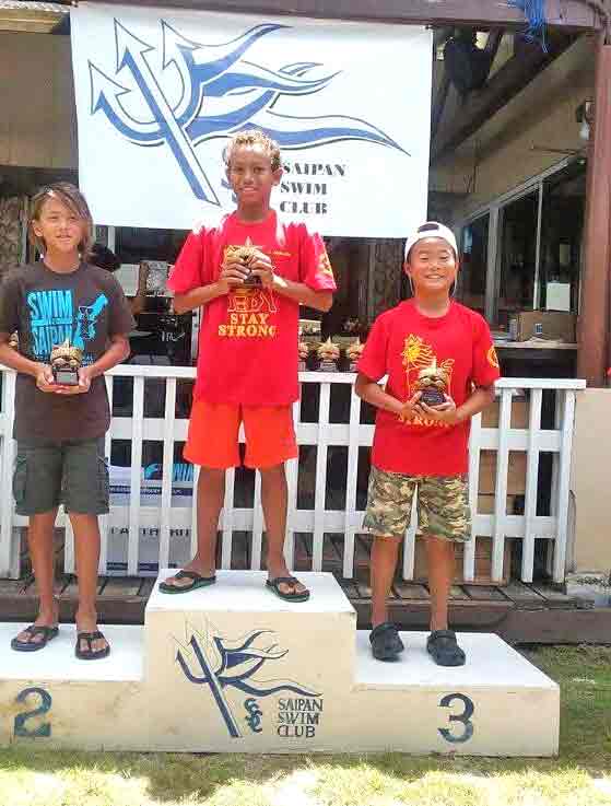 Champion Isaiah Aleksenko of Tsunami Saipan is flanked by runners-up Israel Poppe, left, of Manhoben Swim Club, and teammate Hans Xu during the awards presentation for the boys 9 to 10 age group.