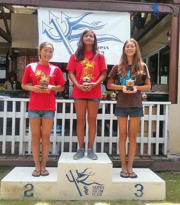 From left, girls 9 to 10’s Top 3 finishers Shoko Litulumar and Ashley Dangol of Tsunami Saipan and SSC’s Kaith Lynn Chavez proudly pose with their trophies.