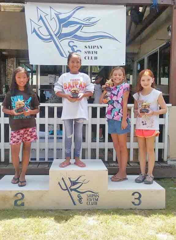 From left, girls U8’s Top 3 placers Julie Anne Chavez of SSC, Maria Batallones of Tsunami Saipan, and Sakura Hara and Anna Kate O’Donnell of Manukai Athletic Club pose for a group photo.