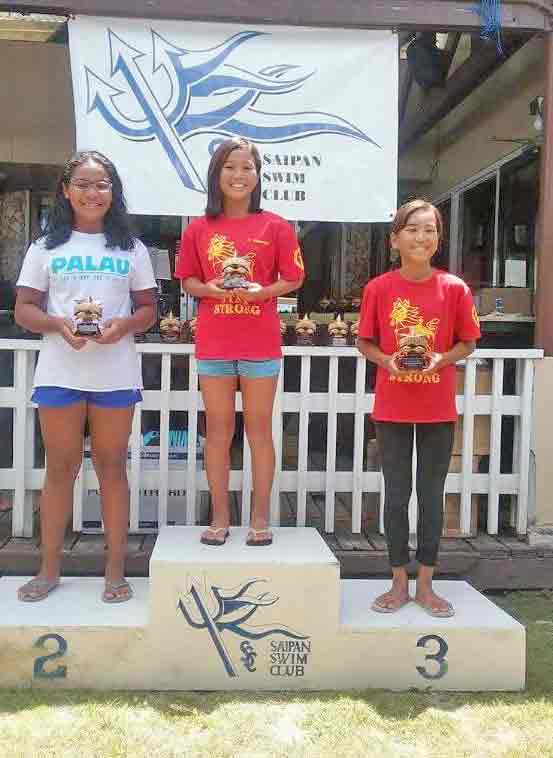 Girls 11 to 12 champion Nanaka Watanabe, center, of Tsunami Saipan is joined at the podium by teammate Asaka Litulumar, right, and Palau’s Klei Andreas.
