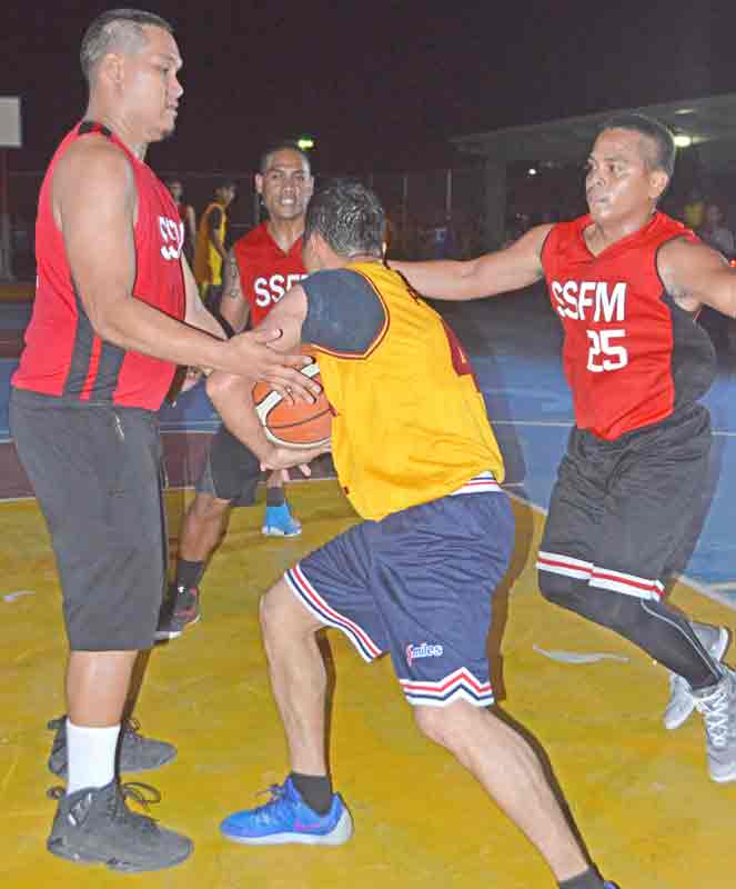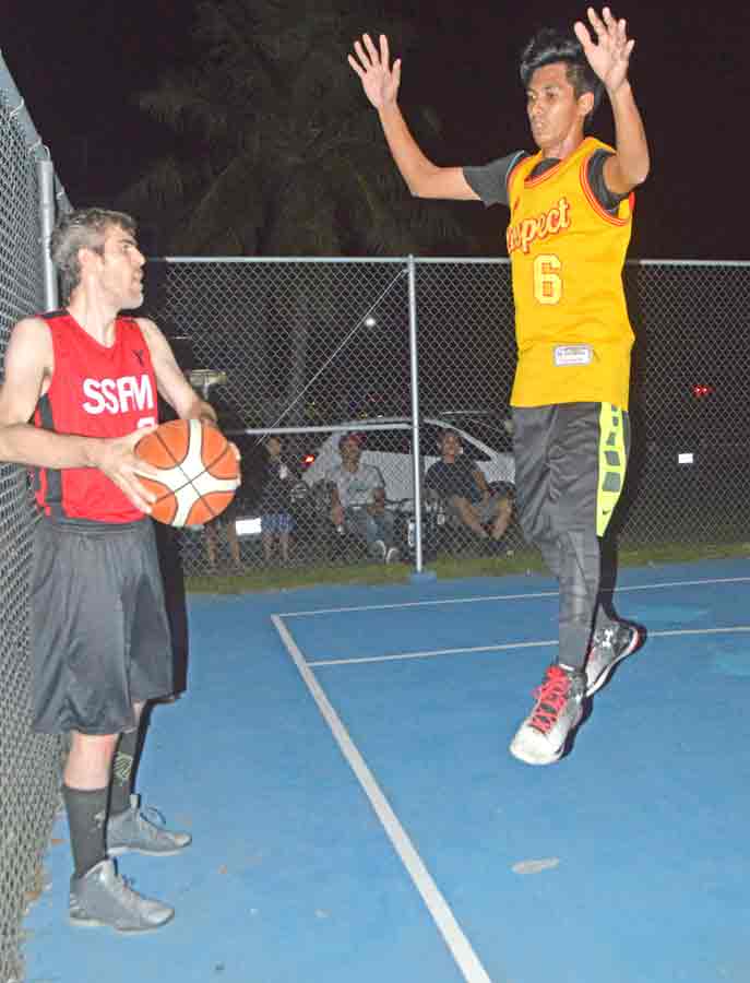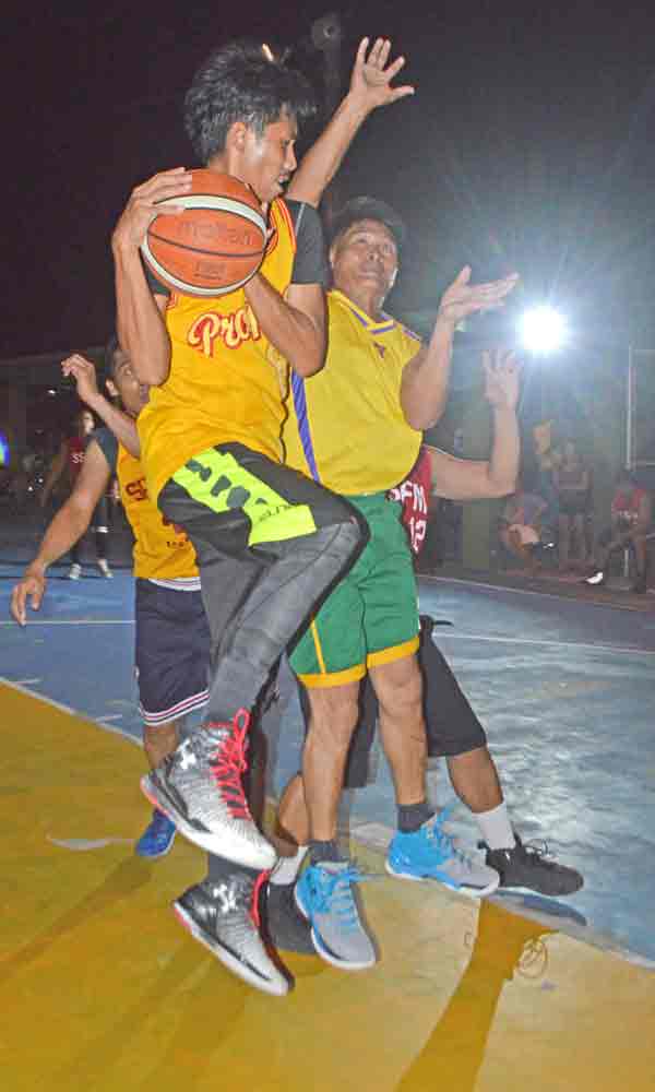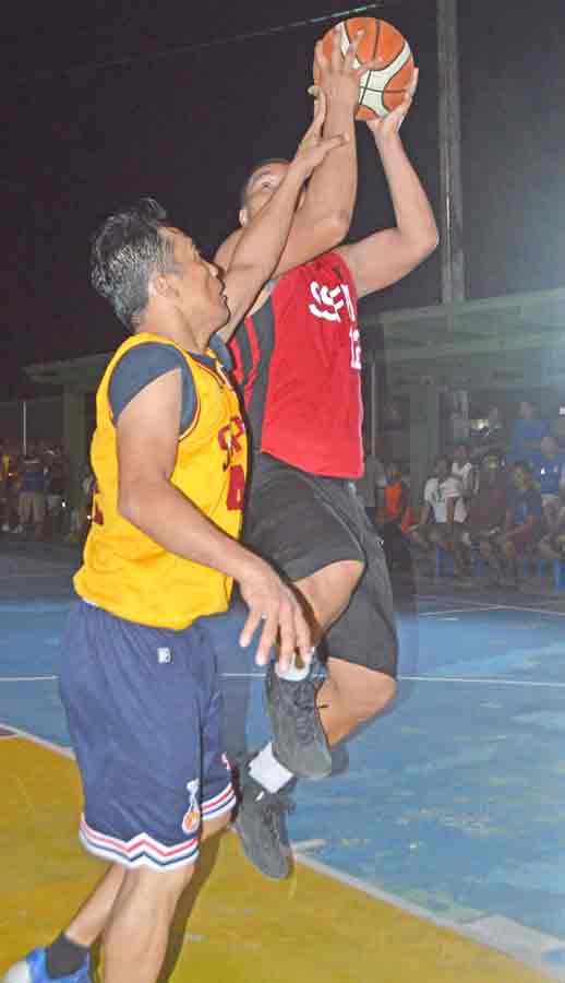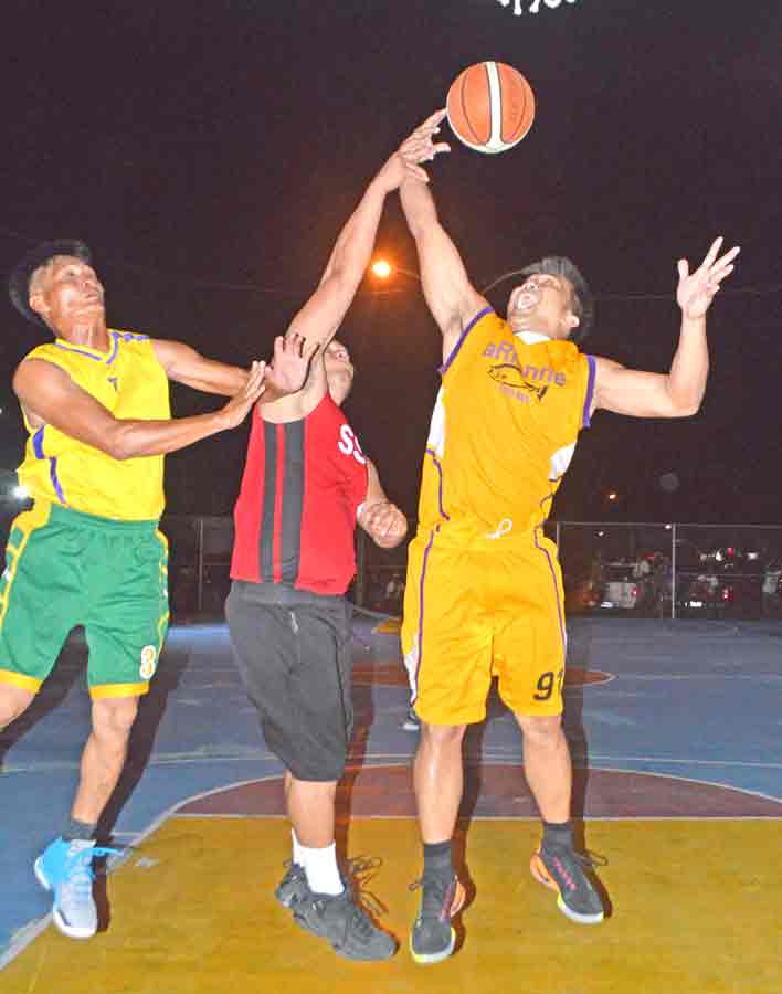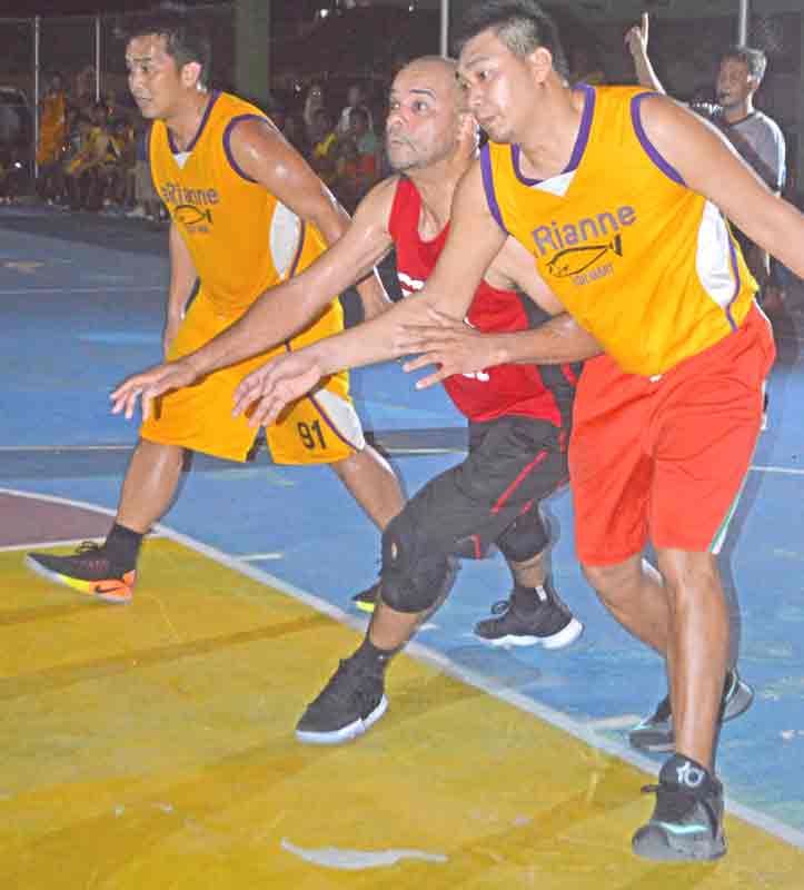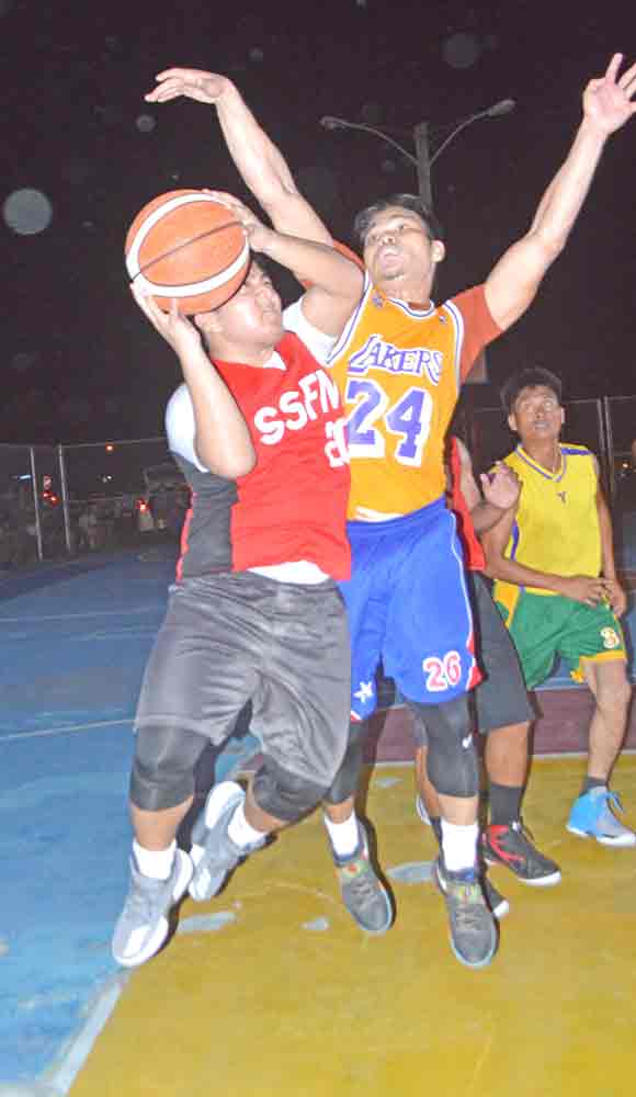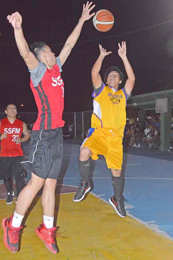 Arianne Fish Mart’s Dexter Guiang, right, collars the rebound against SSFM’s Jack Lizama, while the latter’s teammate Randy Mungcal stays close in the play during their title game in the 2017 San Antonio Summer Basketball League last month at the San Antonio court.