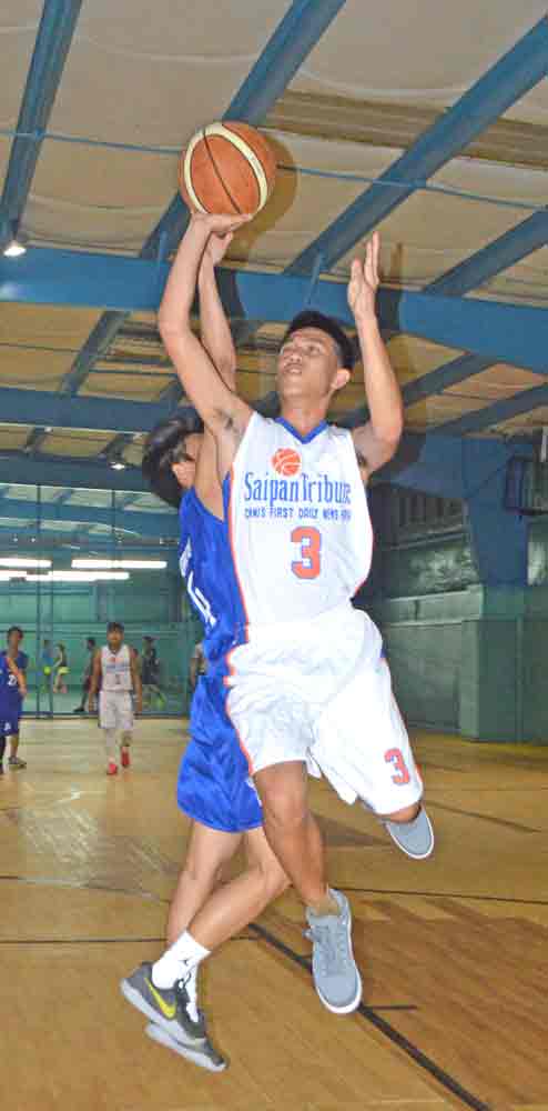 The Lower Base Warriors’ John Benavente goes for a reverse layup against two POI Aviation defenders during their first round game in the 2017 Tan Holdings Inter-Company Basketball League at the Gillette Multipurpose Gymnasium.