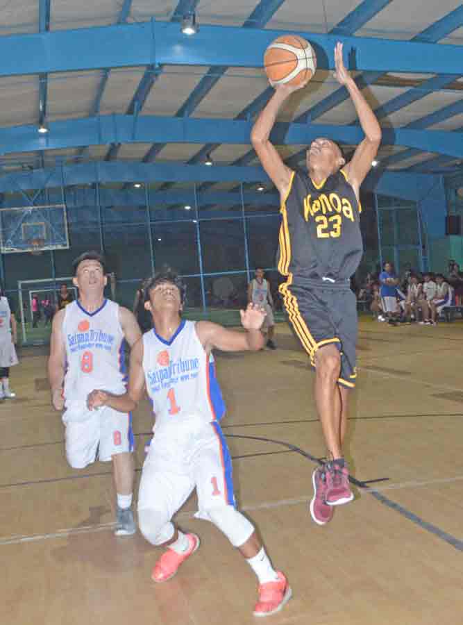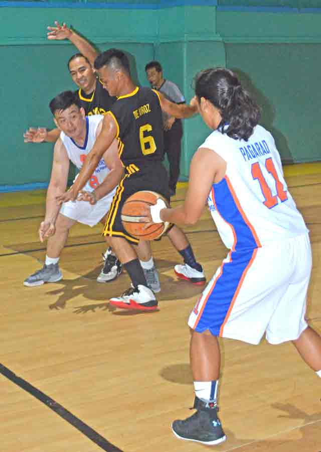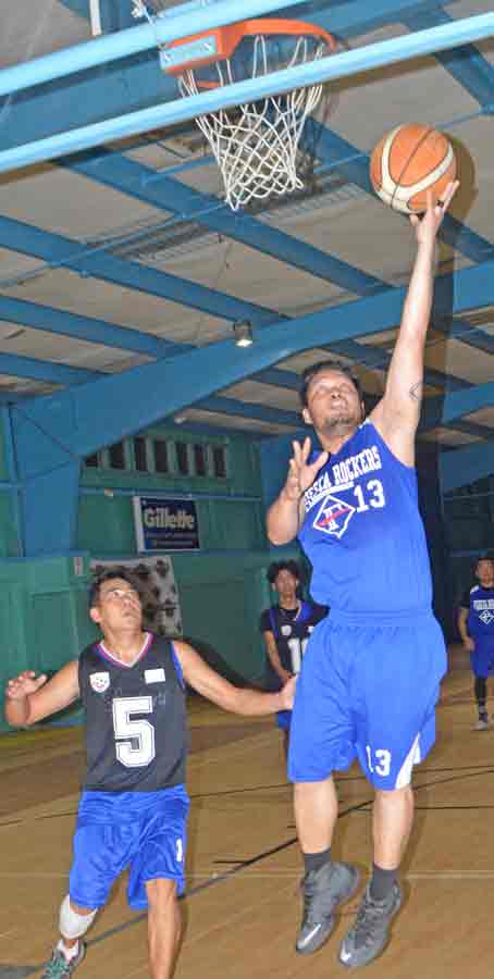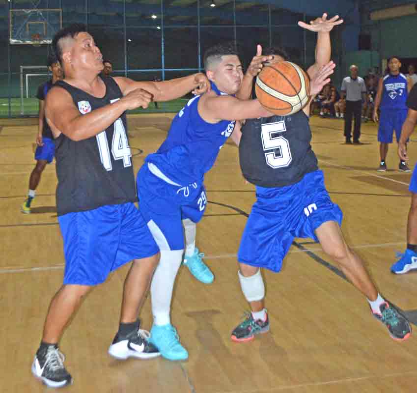 Kanoa Resort’s Sonny Encarnacion pulls up for a shot against three Saipan Tribune defenders during their semis game in the 2017 Tan Holdings Inter-Company Basketball League last Friday at the Gillette Multipurpose Gymnasium.
