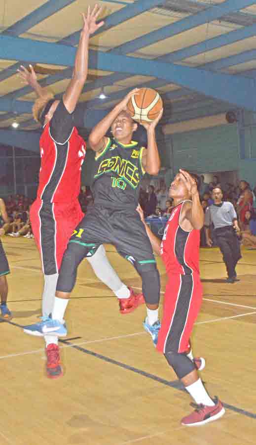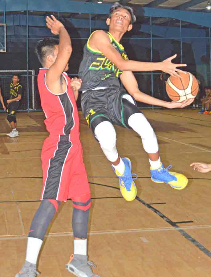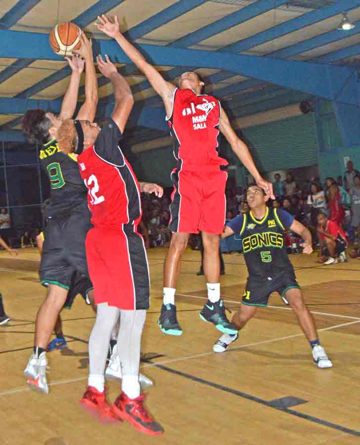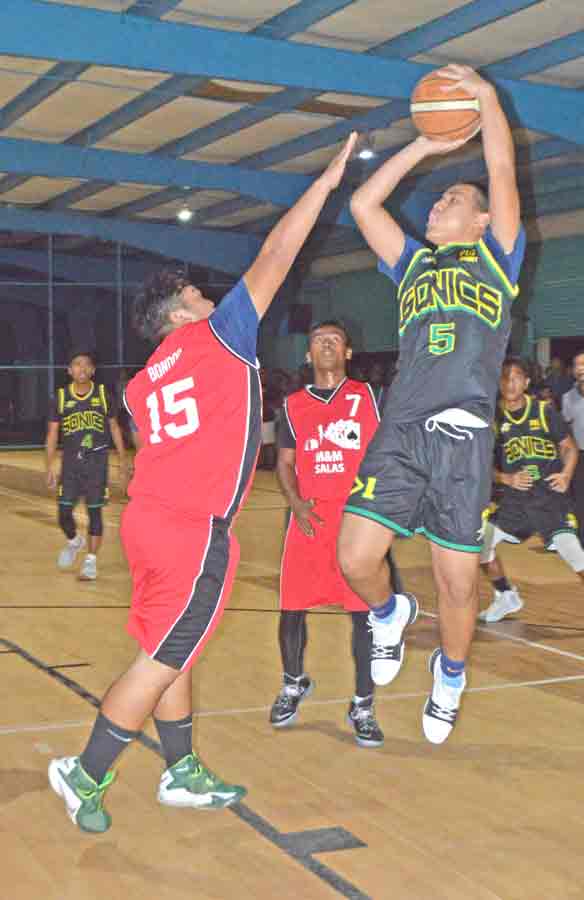 M&M Salas Ol’Aces Coby Santos loses the ball to the baseline, while the 670 Sonics XVIII’s John Malasarte, left, and Emmanuel Cobacha stay close in the play.
