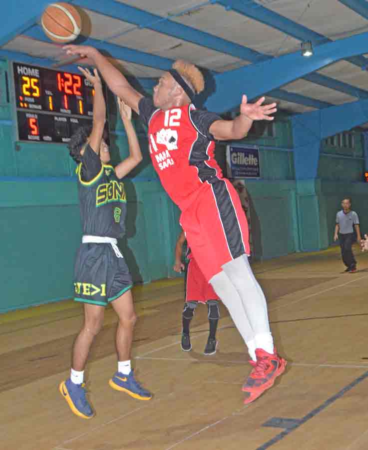 The 670 Sonics XVIII’s Sean Apasan, right, is fouled by M&M Salas Ol’Aces’ Dean Blake during the first half of their title game in the 2017 TanHoldings Christmas Basketball Tournament last Saturday night at the Gillette Multipurpose Gymnasium.
