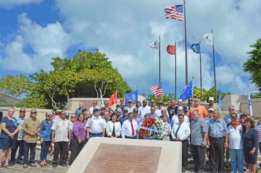 Gov. Ralph DLG Torres, Lt. Gov. Victor B. Hocog, and Delegate Gregorio Kilili C. Sablan (Ind-MP) pose for a photo with Vietnam War veterans at the American Memorial Park as part of the commemoration of Veterans Day last Saturday. (Erwin Encinares)