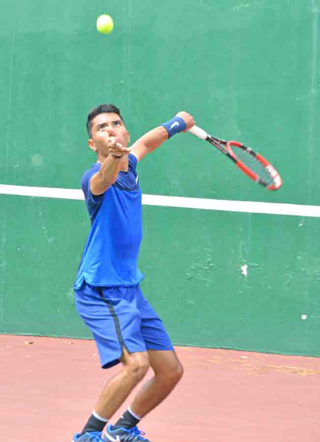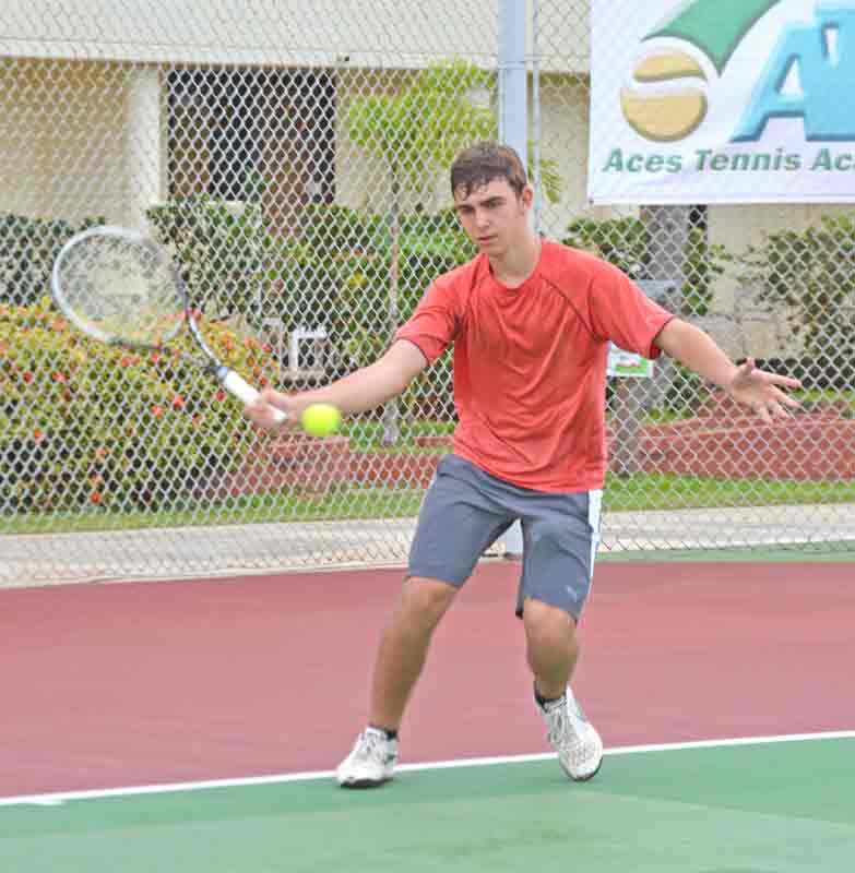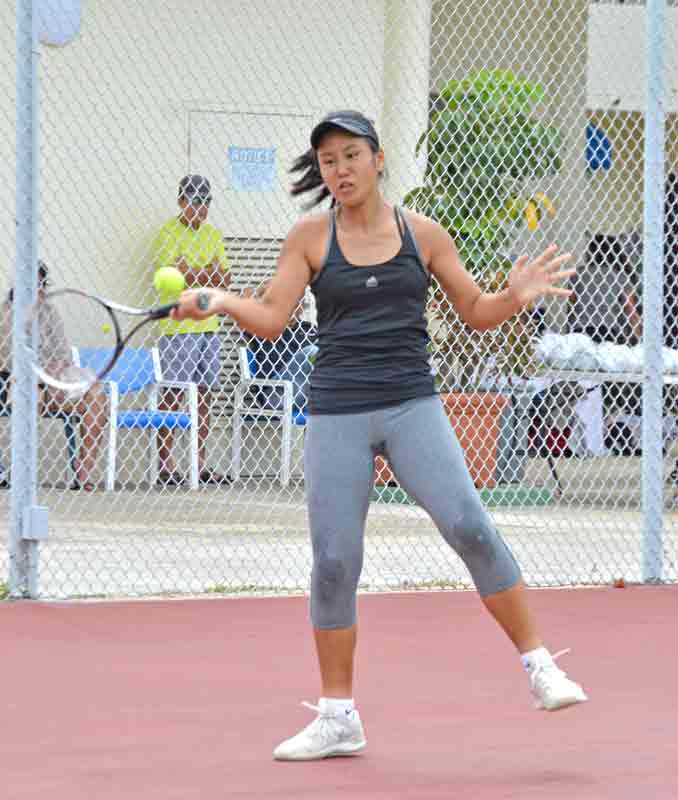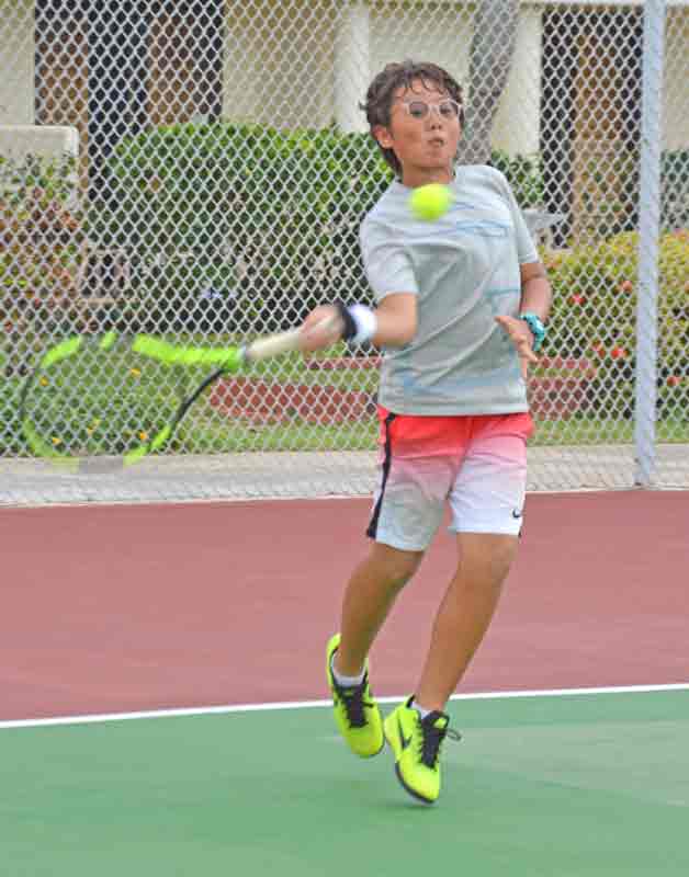 Brian Wessel goes for a baseline return during his and Riko Ojima mixed-up doubles game against Andy Kim and Colin Ramsey in the 2017 White Coconut Tennis Classic held last month at the Pacific Islands Club courts.